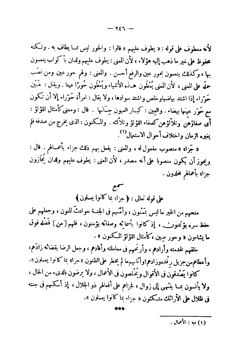 | | لأنه معطوف على قوله : ! 2 < يطوف عليهم > 2 ! قالوا : والحور ليس مما يطاف به . ولكنه | محفوظ على غير ما ذهب إليه هؤلاء , لأن المعنى : يطوف عليهم ولدان بأكواب ينعمون | بها , وكذلك ينعمون بحور عين والرفع أحسن . والمعنى : ولهم حور عين ومن نصب | حمله على المعنى , لأن المعنى يعطون هذه الأشياء ويعطون حورا عينا . ويقال : عين | حوراء إذا اشتد بياضها وخلص واشتد سوادها , ولا يقال : امرأة حوراء إلا أن تكون | مع حور عينها بيضاء . والعين : كبار العيون حسانها . قال : ومعنى كأمثال اللؤلؤ : | أي صفاؤهن وتلألؤهن كصفاء اللؤلؤ وتلألئه . والمكنون : الذي يخرج من صدفه فلم | يغيره الزمان واختلاف أحوال الاستعمال . | | ' جزاء ' منصوب مفعول له , والمعنى : يفعل بهم ذلك جزاء بأعمالهم . قال : | ويجوز أن يكون منصوباً على أنه مصدر , لأن المعنى : يطوف عليهم ولدان يجازون | جزاء بأعمالهم مخلدون . | سجع | على قوله تعالى : ! 2 < جزاء بما كانوا يعملون > 2 ! | منحهم من الخير ما ليس بممنون , وأمنهم في الجنة حوادث المنون , وجعلهم على | حفظ سره يؤتمنون , إذ كانوا بأسمائه وصفاته يؤمنون , فلهم [ من ] فضله فوق | ما يشاءون ! 2 < وحور عين كأمثال اللؤلؤ المكنون > 2 ! . | | خلقهم لخدمته وأرادهم , وأربحهم في معاملته وأفادهم , وجعل الرضا بقضائه زادهم , | وأعطاهم من جزيل رفده وزادهم ؛ وأثابهم ما لم يخطر على الظنون ! 2 < جزاء بما كانوا يعملون > 2 ! . | | كانوا يصدقون في الأقوال ويخلصون في الأعمال , ولا يرضون بالدنىء من الحال , | ولا يأنسون بما ينتهي إلى زوال , فجزاهم على أفعالهم ذو الجلال , إذ أسكنهم في جنته | في ظلال على الأرائك متكئون ! 2 < جزاء بما كانوا يعملون > 2 ! . |