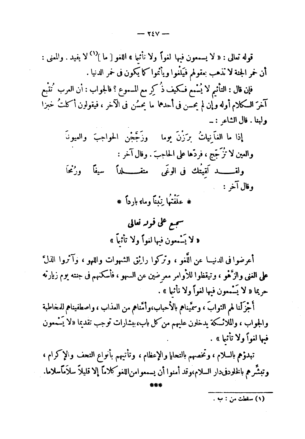 | | قوله تعالى : ! 2 < لا يسمعون فيها لغوا ولا تأثيما > 2 ! اللغو [ ما ] لا يفيد . والمعنى : | أن خمر الجنة لا تذهب بعقولهم فيلغوا ويأثموا كما يكون في خمر الدنيا . | | فإن قال : التأثيم لا يسمع فكيف ذكر مع المسموع ؟ فالجواب : أن العرب تتبع | آخر الكلام أوله وإن لم يحسن في أحدهما ما يحسن في الآخر , فيقولون أكلت خبزاً | ولبناً . قال الشاعر : | | ( إذا ما الغانيات برزن يوماً % وزججن الحواجب والعيون ) % | | والعين لا تزجج , فردها على الحاجب . وقال آخر : | | ( ولقد لقيتك في الوغى % متقلداً سيفا ورمحا ) % | | وقال آخر : | | ( علفتها تبناً وماء باردا % ) % | سجع على قوله تعالى | ! 2 < لا يسمعون فيها لغوا ولا تأثيما > 2 ! | أعرضوا في الدنيا عن اللغو , وتركوا رائق الشهوات واللهو , وآثروا الذل | على الغنى والزهو , وتيقظوا للأوامر معرضين عن السهو , فأسكنهم في جنته يوم زيارته | حريما ! 2 < لا يسمعون فيها لغوا ولا تأثيما > 2 ! . | | أجزلنا لهم الثواب , وسميناهم بالأحباب , وأمناهم من العذاب , واصطفيناهم للمخاطبة | والجواب , والملائكة يدخلون عليهم من كل باب , ببشارات توجب تقديما ! 2 < لا يسمعون فيها لغوا ولا تأثيما > 2 ! . | | تبدؤهم بالسلام , وتخصهم بالتحايا والإعظام , وتأتيهم بأنواع التحف والإكرام , | وتبشرهم بالخلود في دار السلام , وقد أمنوا أن يسمعوا من اللغو كلاماً إلا قليلاً سلاماً سلاما . |
