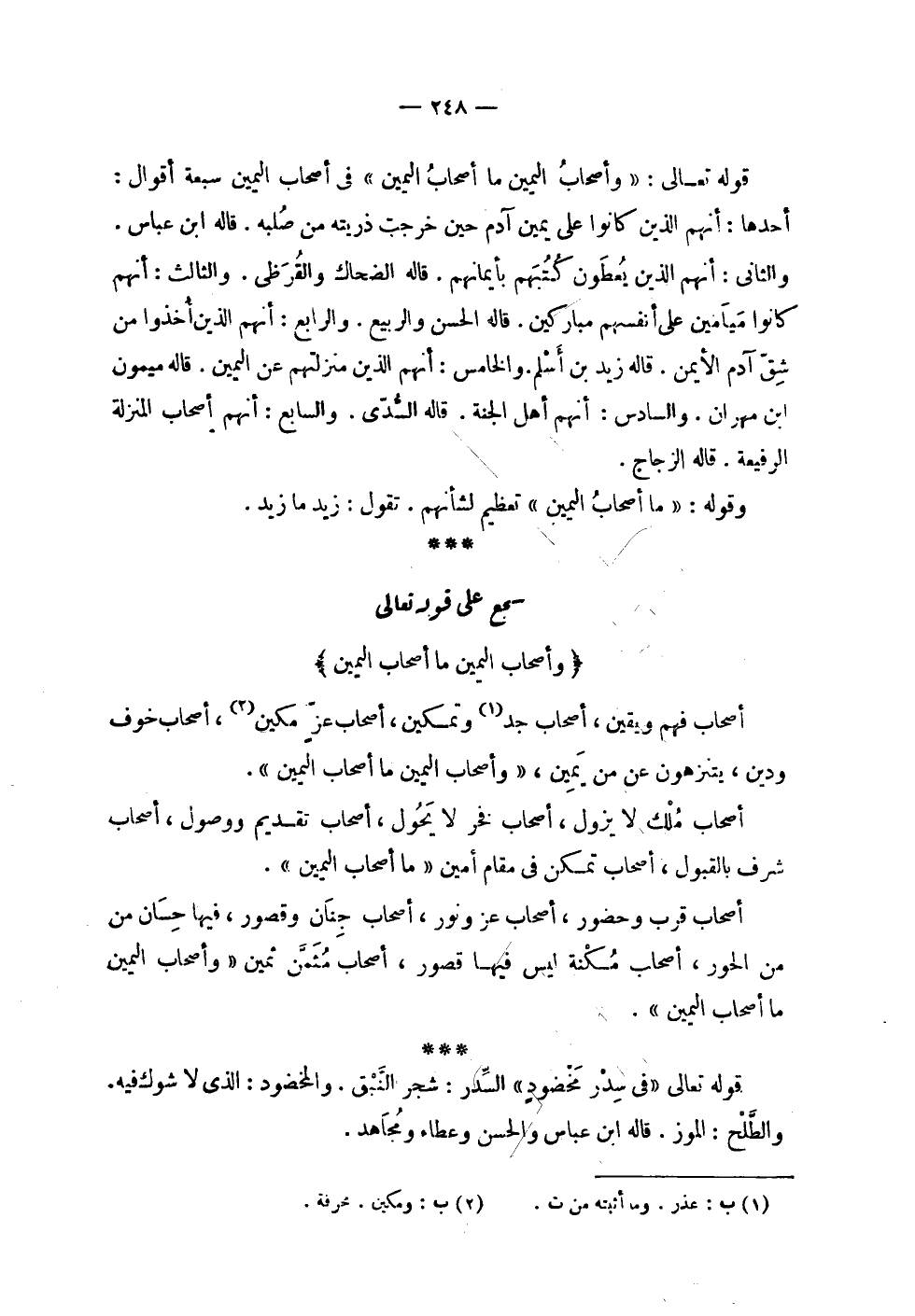 | | قوله تعالى : ! 2 < وأصحاب اليمين ما أصحاب اليمين > 2 ! في أصحاب اليمين سبعة أقوال : | أحدها : أنهم الذين كانوا على يمين آدم حين خرجت ذريته من صلبه . قاله ابن عباس . | والثاني : أنهم الذين يعطون كتبهم بأيمانهم . قاله الضحاك والقرظي . والثالث : أنهم | كانوا ميامين على أنفسهم مباركين . قاله الحسن والربيع . والرابع : أنهم الذين أخذوا من | شق آدم الأيمن . قاله زيد بن أسلم . والخامس : أنهم الذين منزلتهم عن اليمين . قاله ميمون | ابن مهران . والسادس : أنهم أهل الجنة . قاله السدي . والسابع : أنهم أصحاب المنزلة | الرفيعة . قاله الزجاج . | | وقوله : ! 2 < ما أصحاب اليمين > 2 ! تعظيم لشأنهم . تقول : زيد ما زيد . | سجع على قوله تعالى | ! 2 < وأصحاب اليمين ما أصحاب اليمين > 2 ! | أصحاب فهم ويقين , أصحاب جد وتمكين , أصحاب عز مكين , أصحاب خوف | ودين , يتنزهون عن من يمين ! 2 < وأصحاب اليمين ما أصحاب اليمين > 2 ! . | | أصحاب ملك لا يزول , أصحاب فخر لا يحول , أصحاب تقديم ووصول , أصحاب | شرف بالقبول , أصحاب تمكن في مقام أمين ! 2 < ما أصحاب اليمين > 2 ! . | | أصحاب قرب وحضور , أصحاب عز ونور , أصحاب جنان وقصور , فيها حسان من | الحور , أصحاب مكنة ليس فيها قصور , أصحاب مثمن ثمين ! 2 < وأصحاب اليمين ما أصحاب اليمين > 2 ! . | | قوله تعالى : ! 2 < في سدر مخضود > 2 ! السدر : شجرة النبق . والمخضود الذي لا شوك فيه . | والطلح : الموز . قاله ابن عباس والحسن وعطاء ومجاهد . |