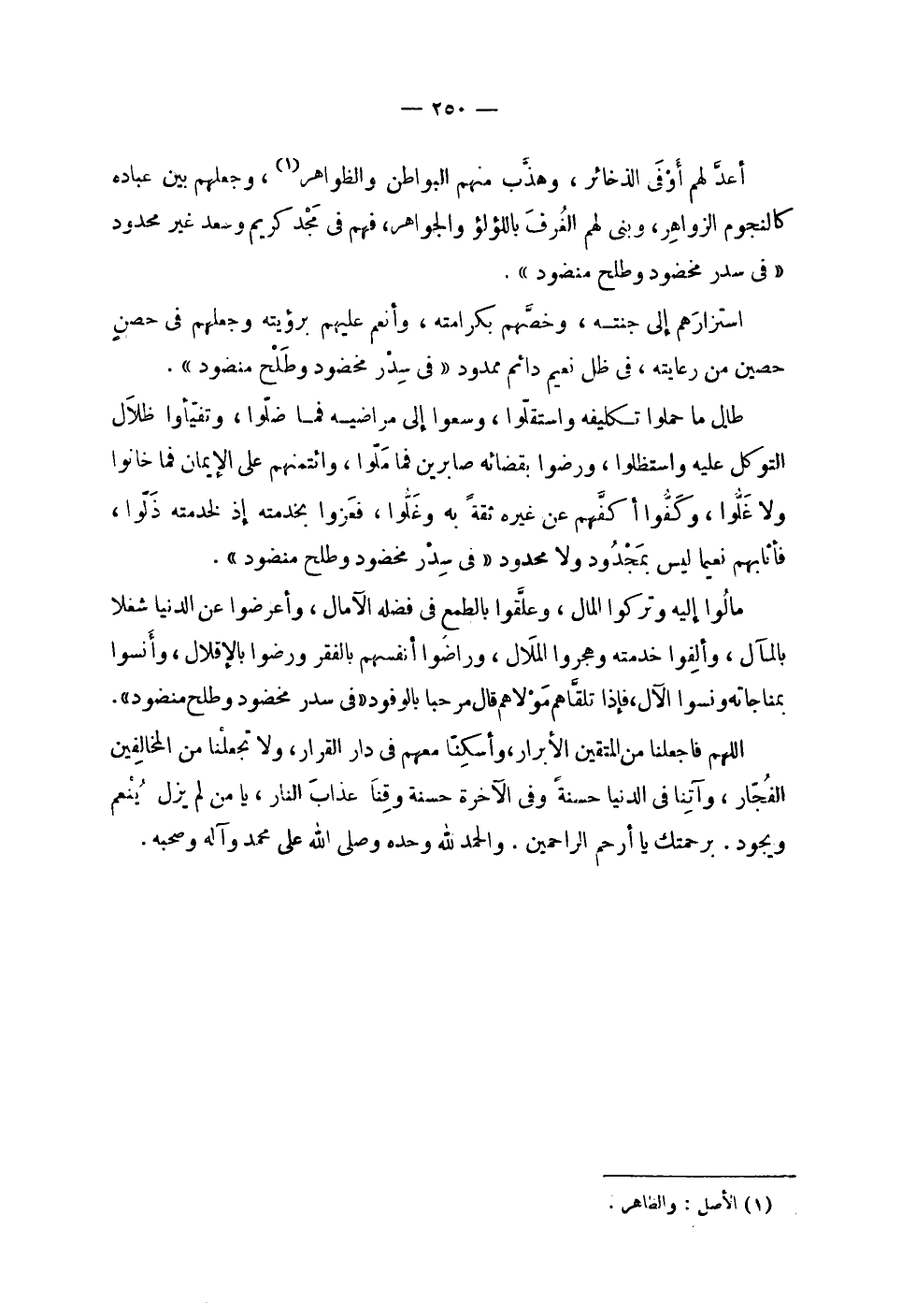 | | أعد لهم أوفى الذخائر , وهذب منهم البواطن والظواهر , وجعلهم بين عباده | كالنجوم الزواهر , وبنى لهم الغرف باللؤلؤ والجواهر , فهم في مجد كريم وسعد غير محدود | ! 2 < في سدر مخضود وطلح منضود > 2 ! . | | استزارهم إلى جنته , وخصهم بكرامته , وأنعم عليهم برؤيته وجعلهم في حصن | حصين من رعايته , في ظل نعيم دائم ممدود ! 2 < في سدر مخضود وطلح منضود > 2 ! . | | طال ما حملوا تكليفه واستقلوا , وسعوا إلى مراضيه فما ضلوا , وتفيأوا ظلال | التوكل عليه واستظلوا , ورضوا بقضائه صابرين فما ملوا , وائتمنهم على الإيمان فما خانوا | ولا غلوا , وكفوا أكفهم في غير ثقة به وغلوا , فعزوا بخدمته إذ لخدمته ذلوا , | فأثابهم نعيماً ليس بمجدود ولا محدود ! 2 < في سدر مخضود وطلح منضود > 2 ! . | | مالوا إليه وتركوا المال , وعلقوا بالطمع في فضله الآمال , وأعرضوا عن الدنيا شغلا | بالمآل , وألفوا خدمته وهجروا الملال , وراضوا أنفسهم بالفقر ورضوا بالإقلال , وأنسوا | بمناجاته ونسوا الآل , فإذا تلقاهم مولاهم قال مرحبا بالوفود ! 2 < في سدر مخضود وطلح منضود > 2 ! . | | اللهم فاجعلنا من المتقين الأبرار , وأسكنا معهم في دار القرار , ولا تجعلنا من المخالفين | الفجار , وآتنا في الدنيا حسنة وفي الآخرة حسنة وقنا عذاب النار , يا من لم يزل ينعم | ويجود . برحمتك يا أرحم الراحمين . والحمد لله وحده وصلى الله على محمد وآله وصحبه . |