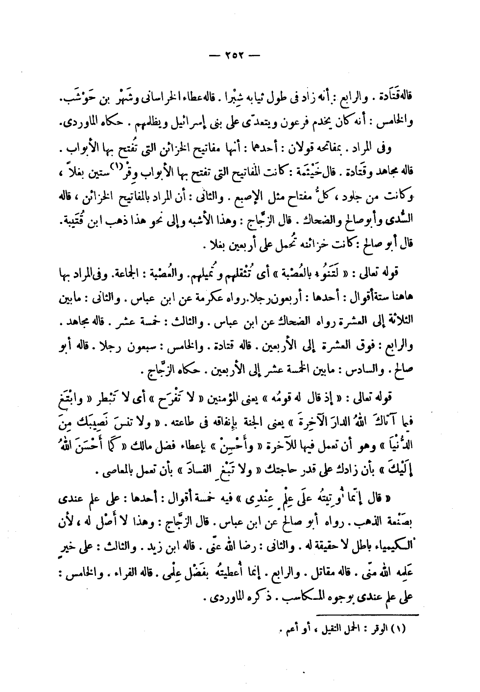 | قاله قتادة . والرابع : أنه زاد في طول ثيابه شبرا . قاله عطاء الخراساني وشهر بن حوشب . | والخامس : أنه كان يخدم فرعون ويتعدى على بني إسرائيل ويظلمهم . حكاه الماوردي . | | وفي المراد بمفاتحه قولان : أحدهما : أنها مفاتيح الخزائن التي تفتح بها الأبواب . | قاله مجاهد وقتادة . قال خيثمة : كانت المفاتيح التي تفتح بها الأبواب وقر ستين بغلاً , | وكانت من جلود , كل مفتاح مثل الإصبع . والثاني : أن المراد بالمفاتيح الخزائن , قاله | السدي وأبو صالح والضحاك . قال الزجاج : وهذا الأشبه وإلى نحو هذا ذهب ابن قتيبة . | قال أبو صالح : كانت خزائنه تحمل على أربعين بغلاً . | | قوله تعالى : ! 2 < لتنوء بالعصبة > 2 ! أي تثقلهم وتميلهم . والعصبة : الجماعة . وفي المراد بها | ها هنا ستة أقوال : أحدها : أربعون رجلاً . رواه عكرمة عن ابن عباس . والثاني : ما بين | الثلاثة إلى العشرة رواه الضحاك عن ابن عباس . والثالث : خمسة عشر . قاله مجاهد . | والرابع : فوق العشرة إلى الأربعين . قاله قتادة . والخامس : سبعون رجلاً . قاله أبو | صالح . والسادس : ما بين الخمسة عشر إلى الأربعين . حكاه الزجاج . | | قوله تعالى : ! 2 < إذ قال له قومه > 2 ! يعني المؤمنين ! 2 < لا تفرح > 2 ! أي لا تبطر ! 2 < وابتغ فيما آتاك الله الدار الآخرة > 2 ! يعني الجنة بإنفاقه في طاعته . ! 2 < ولا تنس نصيبك من الدنيا > 2 ! وهو أن تعمل فيها للآخرة ! 2 < وأحسن > 2 ! بإعطاء فضل مالك ! 2 < كما أحسن الله إليك > 2 ! بأن زادك على قدر حاجتك ! 2 < ولا تبغ الفساد > 2 ! بأن تعمل بالمعاصي . | | ! 2 < قال إنما أوتيته على علم عندي > 2 ! فيه خمسة أقوال : أحدها : على علم عندي | بصنعة الذهب . رواه أبو صالح عن ابن عباس . قال الزجاج : وهذا لا أصل له , لأن | الكيمياء باطل لا حقيقة له . والثاني : رضا الله عني . قاله ابن زيد . والثالث : على خير | علمه الله مني . قاله مقاتل . والرابع : إنما أعطيته بفضل علمي . قاله الفراء . والخامس : | على علم عندي بوجوده المكاسب . ذكره الماوردي .