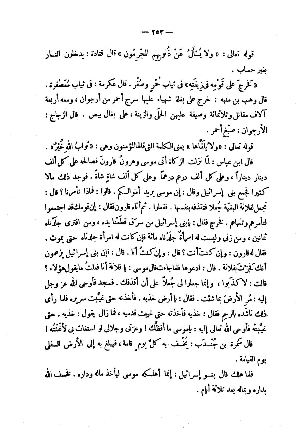 | | قوله تعالى : ! 2 < ولا يسأل عن ذنوبهم المجرمون > 2 ! قال قتادة : يدخلون النار | بغير حساب . | | ! 2 < فخرج على قومه في زينته > 2 ! في ثياب حمر وصفر . قال عكرمة : في ثياب معصفرة . | قال وهب بن منبه : خرج على بغلة شهباء عليها سرج أحمر من أرجوان , ومعه أربعة آلاف مقاتل وثلاثمائة وصيفة عليهن الحلى والزينة . على بغال بيض . قال الزجاج : | الأرجوان : صبغ أحمر . | | قوله تعالى : ! 2 < ولا يلقاها > 2 ! يعني الكلمة التي قالها المؤمنون وهي : ' ! 2 < ثواب الله خير > 2 ! ' . | | قال ابن عباس : لما نزلت الزكاة أتى موسى وهارون قارون فصالحه على كل ألف | دينار دينارا , وعلى كل ألف درهم درهما , وعلى كل ألف شاة شاة . فوجد ذلك مالا | كثيراً فجمع بني إسرائيل وقال : إن موسى يريد أموالكم . قالوا : فماذا تأمرنا ؟ قال : | نجعل لفلانة البغية جعلا فتقذفه بنفسها . ففعلوا . ثم أتاه قارون فقال : إن قومك قد اجتمعوا | لتأمرهم وتنهاهم . فخرج فقال : يا بني إسرائيل من سرق قطعنا يده , ومن افترى جلدناه | ثمانين , ومن زنى وليست له امرأة جلدناه مائة فإن كانت له امرأة جلدناه حتى يموت . | فقال له قارون : وإن كنت أنت ؟ قال : وإن كنت أنا . قال : فإن بني إسرائيل يزعمون | أنك فجرت بفلانة . قال : ادعوها : فلما جاءت قال موسى : يا فلانة أنا فعلت ما يقول هؤلاء ؟ | قالت : لا كذبوا , وإنما جعلوا لي جعلا على أن أقذفك . فسجد فأوحى الله عز وجل | إليه : مُر الأرض بما شئت . فقال : يا أرض خذيه . فأخذته حتى غيبت سريره , فلما رأى | ذلك ناشده بالرحم فقال : خذيه فأخذته حتى غيبت قدميه , فما زال يقول : خذيه . حتى | غيبته فأوحى الله تعالى إليه : يا موسى ما أفظك ! وعزتي وجلالي لو استغاث بي لأغثته ! | | قال سمرة بن جندب : يخسف به كل يوم قامة , فيبلغ به إلى الأرض السفلى | يوم القيامة . | | فلما هلك قال بنو إسرائيل : إنما أهلكه موسى ليأخذ ماله وداره . فخسف الله | بداره وبماله بعد ثلاثة أيام . |