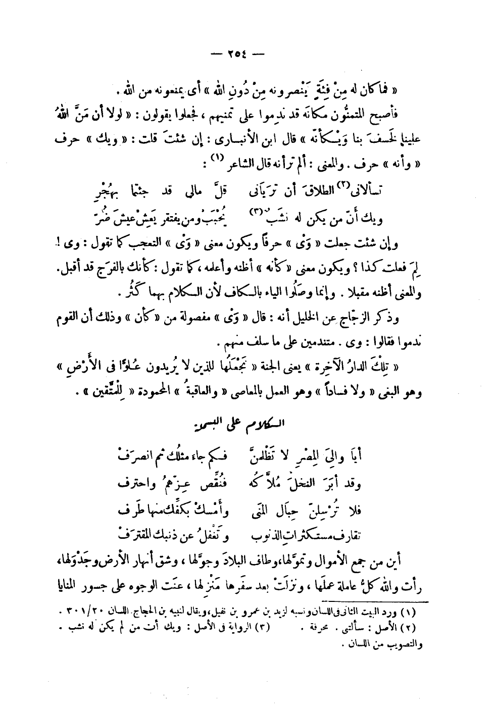 | | ! 2 < فما كان له من فئة ينصرونه من دون الله > 2 ! أي يمنعونه من الله . | | فأصبح المتمنون مكانه قد ندموا على تمنيهم , فجعلوا يقولون : ! 2 < لولا أن من الله علينا لخسف بنا ويكأنه > 2 ! قال ابن الأنباري : إن شئت قلت : ' ويك ' حرف | ' وأنه ' حرف . والمعنى : ألم تر أنه قال الشاعر : | | ( تسألاني الطلاق أن ترياني % قل مالي قد جئتما بهجر ) % | | ( ويك أن من يكن له نشب % يحبب ومن يفتقر يعش عيش ضر ) % | | وإن شئت جعلت ' وي ' حرفا ويكون معنى ' وي ' التعجب كما تقول : وي ! | لم فعلت كذا ؟ ويكون معنى ' كأنه ' أظنه وأعلمه , كما تقول : كأنك بالفرج قد أقبل . | والمعنى أظنه مقبلا . وإنما وصلوا الياء بالكاف لأن الكلام بهما كثر . | | وذكر الزجاج عن الخليل أنه قال : ' وي ' مفصولة من ' كأن ' وذلك أن القوم | ندموا فقالوا : وي . متندمين على ما سلف منهم . | | ! 2 < تلك الدار الآخرة > 2 ! يعني الجنة ! 2 < نجعلها للذين لا يريدون علوا في الأرض > 2 ! | وهو البغي ! 2 < ولا فسادا > 2 ! وهو العمل بالمعاصي ! 2 < والعاقبة > 2 ! المحمودة ! 2 < للمتقين > 2 ! . | الكلام على البسملة | | ( أيا والي المصر لا تظلمن % فكم جاء مثلك ثم انصرف ) % | | ( وقد أبر النخل ملاكه % فنقص عزهم واحترف ) % | | ( فلا ترسلن حبال المنى % وأمسك بكفك منها طرف ) % | | ( تقارف مستكثرات الذنوب % وتغفل عن ذنبك المقترف ) % | | أين من جمع الأموال وتمولها , وطاف البلاد وجولها , وشق أنهار الأرض وجدولها , | رأت والله كل عاملة عملها , ونزلت بعد سفرها منزلها , عنت الوجوه على جسور المنايا |