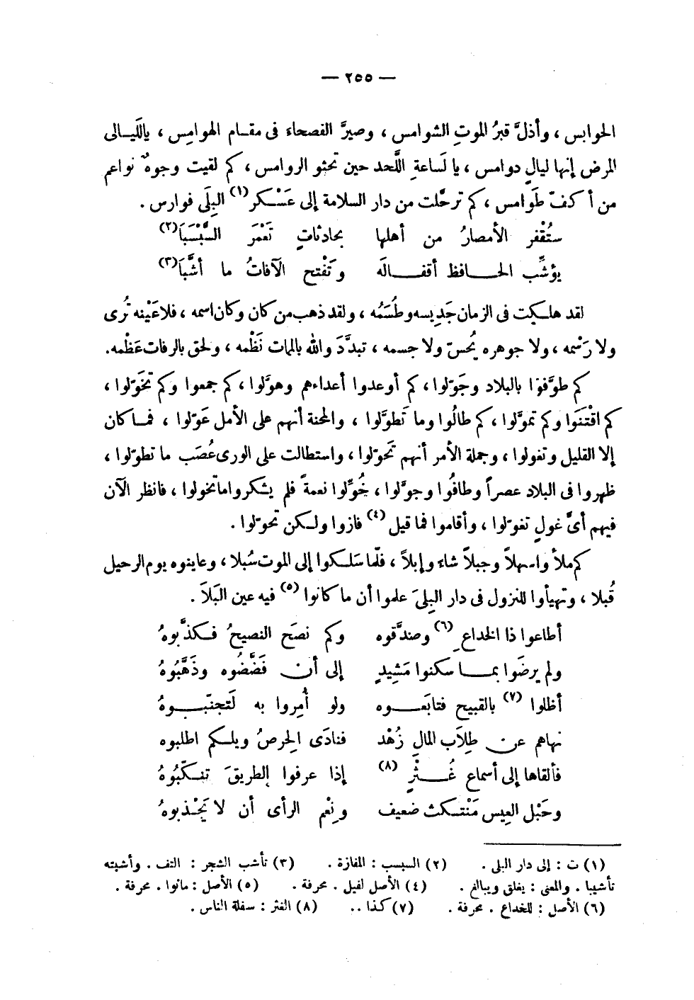 | الحوابس , وأذل قبر الموت الشوامس , وصير الفصحاء في مقام الهوامس , يا لليالي | المرض إنها ليال دوامس , يا لساعة اللحد حين تحثو الروامس , كم لقيت وجوه نواعم | من أكف طوامس , كم ترحلت من دار السلامة إلى عسكر البلى فوارس . | | ( ستقفر الأمصار من أهلها % بحادثات تعمر السبسبا ) % | | ( يؤشب الحافظ أقفاله % وتفتح الآفات ما أشبا ) % | | لقد هلكت في الزمان جديسه وطسمه , ولقد ذهب من كان وكان اسمه , فلا عينه ترى | ولا رسمه , ولا جوهره يحس ولا جسمه , تبدد والله بالممات نظمه , ولحق بالرفات عظمه . | | كم طوفوا بالبلاد وجولوا , كم أوعدوا أعداءهم وهولوا , كم جمعوا وكم تخولوا , | كم اقتنوا وكم تمولوا , كم طالوا وما تطولوا , والمحنة أنهم على الأمل عولوا , فما كان | إلا القليل وتغولوا , وجملة الأمر أنهم تحولوا , واستطالت على الورى عصب ما تطولوا , | ظهروا في البلاد عصرا وطافوا وجولوا , خولوا نعمة فلم يشكروا ما تخولوا , فانظر الآن | فيهم أي غول تغولوا , وأقاموا فما قيل فازوا ولكن تحولوا . | | كم ملأوا سهلاً وجبلاً شاء وإبلا , فلما سلكوا إلى الموت سبلا , وعاينوه يوم الرحيل | قبلا , وتهيأوا للنزول في دار البلى علموا أن ما كانوا فيه عين البلا . | | ( أطاعوا ذا الخداع وصدقوه % وكم نصح النصيح فكذبوه ) % | | ( ولم يرضوا بما سكنوا مشيد % إلى أن فضضوه وذهبوه ) % | | ( أظلوا بالقبيح فتابعوه % ولو أمروا به لتجنبوه ) % | | ( نهاهم عن طلاب المال زهد % فنادى الحرص ويلكم اطلبوه ) % | | ( فألقاها إلى أسماع غثر % إذا عرفوا الطريق تنكبوه ) % | | ( وحبل العيس منتكث ضعيف % ونعم الرأي أن لا يجذبوه ) % |