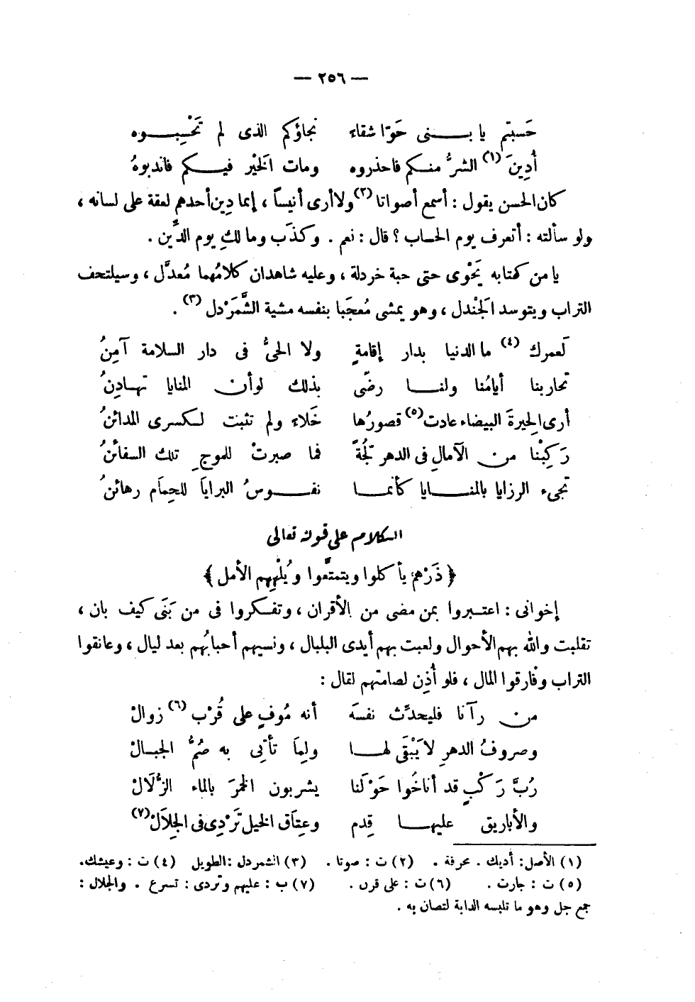| | ( حسبتم يا بني حوا شقاء % نجاؤكم الذي لم تحسبوه ) % | | ( أدين الشر منكم فاحذروه % ومات الخير فيكم فاندبوه ) % | | كان الحسن يقول : أسمع أصواتاً ولا أرى أنيسا , إنما دين أحدهم لعقة على لسانه , | ولو سألته : أتعرف يوم الحساب ؟ قال : نعم . وكذب ومالك يوم الدين . | | يا من كتابه يحوي حتى حبة خردلة , وعليه شاهدان كلامهما معدل , وسيلتحف | التراب ويتوسد الجندل , وهو يمشي معجباً بنفسه مشية الشمردل . | | ( لعمرك ما الدنيا بدار إقامة % ولا الحي في دار السلامة آمن ) % | | ( تحاربنا أيامنا ولنا رضى % بذلك لو أن المنايا تهادن ) % | | ( أرى الحيرة البيضاء عادت قصورها % خلاء ولم تثبت لكسرى المدائن ) % | | ( ركبنا من الآمال في الدهر لجة % فما صبرت للموج تلك السفائن ) % | | ( تجيء الرزايا بالمنايا كأنما % نفوس البرايا للحمام رهائن ) % | الكلام على قوله تعالى | ! 2 < ذرهم يأكلوا ويتمتعوا ويلههم الأمل > 2 ! | إخواني : اعتبروا بمن مضى من الأقران , وتفكروا في من بنى كيف بان , | تقلبت والله بهم الأحوال ولعبت بهم أيدي البلبال , ونسيهم أحبابهم بعد ليال , وعانقوا | التراب وفارقوا المال , فلو أذن لصامتهم لقال : | | ( من رآنا فليحدث نفسه % أنه موف على قرب زوال ) % | | ( وصروف الدهر لا يبقى لها % ولما تأتي به صم الجبال ) % | | ( رب ركب قد أناخوا حولنا % يشربون الخمر بالماء الزلال ) % | | ( والأباريق عليها قدم % وعتاق الخيل تردى في الجلال ) % |