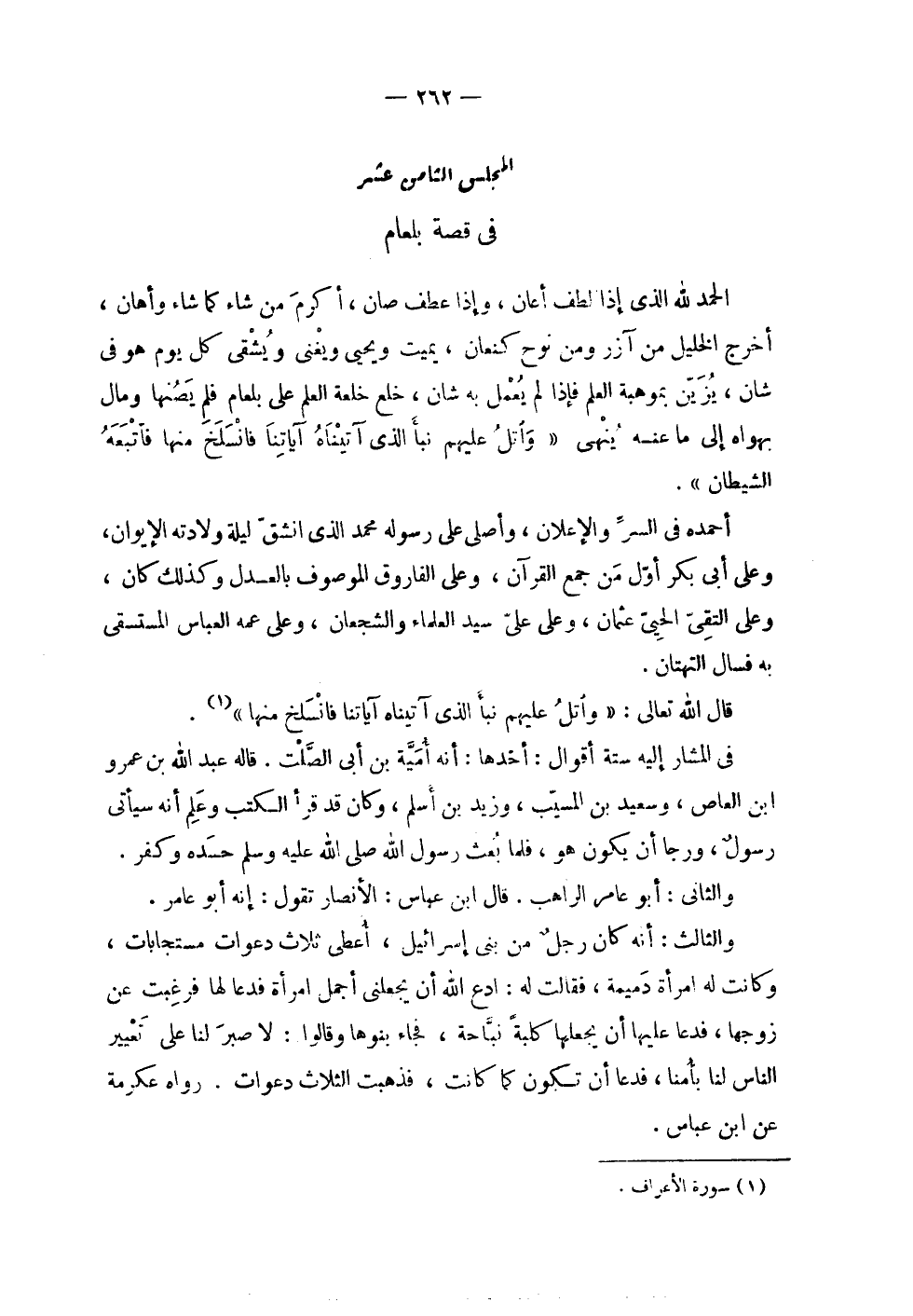| المجلس الثامن عشر | في قصة بلعام | | الحمد لله الذي إذا لطف أعان , وإذا عطف صان , أكرم من شاء كما شاء وأهان , | أخرج الخليل من آزر ومن نوح كنعان , يميت ويحيي ويغني ويشقي كل يوم هو في | شان , يزين بموهبة العلم فإذا لم يعمل به شان , خلع خلعة العلم على بلعم فلم يصنها ومال | بهواه إلى ما عنه ينهى ! 2 < واتل عليهم نبأ الذي آتيناه آياتنا فانسلخ منها فأتبعه الشيطان > 2 ! | | أحمده في السر والإعلان , وأصلي على رسوله محمد الذي انشق ليلة ولادته الإيوان , | وعلى أبي بكر أول من جمع القرآن , وعلى الفاروق الموصوف بالعدل وكذلك كان , | وعلى التقي الحيي عثمان , وعلى علي سيد العلماء والشجعان , وعلى عمه العباس المستسقى | به فسال التهتان . | | قال الله تعالى : ! 2 < واتل عليهم نبأ الذي آتيناه آياتنا فانسلخ منها > 2 ! . | | في المشار إليه ستة أقوال : أحدها : أنه أمية بن أبي الصلت . قاله عبد الله بن عمرو | ابن العاص , وسعيد بن المسيب , وزيد بن أسلم ، وكان قد قرأ الكتب وعلم أنه سيأتي | رسول , ورجا أن يكون هو , فلما بعث رسول الله صلى الله عليه وسلم حسده وكفر . | | والثاني : أبو عامر الراهب . قال ابن عباس : الأنصار تقول : إنه أبو عامر . | | والثالث : أنه كان رجل من بني إسرائيل , أعطي ثلاث دعوات مستجابات , | وكانت له امرأة دميمة , فقالت له : ادع الله أن يجعلني أجمل امرأة فدعا لها فرغبت عن | زوجها , فدعا عليها أن يجعلها كلبة نباحة , فجاء بنوها وقالوا : لا صبر لنا على تعيير | الناس لنا بأمنا , فدعا أن تكون كما كانت ، فذهبت الثلاث دعوات . رواه عكرمة | عن ابن عباس . |