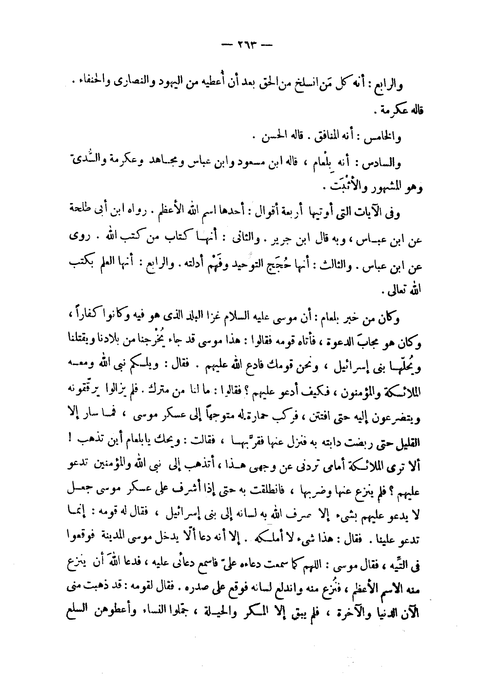 | | والرابع : أنه كل من انسلخ من الحق بعد أن أعطيه من اليهود والنصارى والحنفاء , | قاله عكرمة . | | والخامس : أنه المنافق . قاله الحسن . | | والسادس : أنه بلعام , قاله ابن مسعود وابن عباس ومجاهد وعكرمة والسدي | وهو المشهور والأثبت . | | وفي الآيات التي أوتيها أربعة أقوال : أحدها اسم الله الأعظم . رواه ابن أبي طلحة | عن ابن عباس , وبه قال ابن جرير . والثاني : أنها كتاب من كتب الله . روى | عن ابن عباس . والثالث : أنها حجج التوحيد وفهم أدلته . والرابع : أنها العلم بكتب | الله تعالى . | | وكان من خبر بلعام : أن موسى عليه السلام غزا البلد الذي هو فيه وكانوا كفاراً , | وكان هو مجاب الدعوة , فأتاه قومه فقالوا : هذا موسى قد جاء يخرجنا من بلادنا ويقتلنا | ويحلها بني إسرائيل , ونحن قومك فادع الله عليهم . فقال : ويلكم نبي الله ومعه | الملائكة والمؤمنون , فكيف أدعو عليهم ؟ فقالوا : ما لنا من مترك . فلم يزالوا يرققونه | ويتضرعون إليه حتى افتتن , فركب حمارة له متوجهاً إلى عسكر موسى , فما سار إلا | القليل حتى ربضت دابته به فنزل عنها فقربها , فقالت : ويحك يا بلعام أين تذهب ! | ألا ترى الملائكة أمامي تردني عن وجهي هذا , أتذهب إلى نبي الله والمؤمنين تدعو | عليهم ؟ فلم ينزع عنها وضربها , فانطلقت به حتى إذا أشرف على عسكر موسى جعل | لا يدعو عليهم بشيء إلا صرف الله به لسانه إلى بني إسرائيل , فقال له قومه : إنما | تدعو علينا . فقال : هذا شيء لا أملكه . إلا أنه دعا ألا يدخل موسى المدينة فوقعوا | في التيه , فقال موسى : اللهم كما سمعت دعاءه علي فاسمع دعائي عليه فدعا ، الله أن ينزع | منه الاسم الأعظم , فنزع منه واندلع لسانه فوقع على صدره . فقال لقومه : قد ذهبت مني | الآن الدنيا والآخرة , فلم يبق إلا المكر والحيلة , جملوا النساء وأعطوهن السلع |