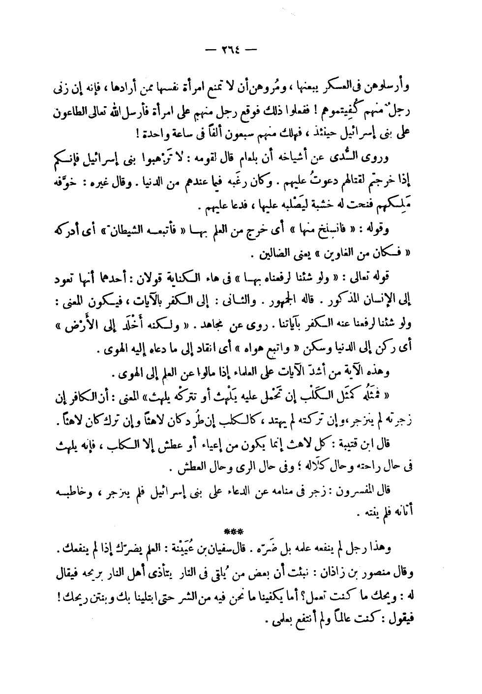 | وأرسلوهن في العسكر يبعنها , ومروهن أن لا تمنع امرأة نفسها ممن أرادها , فإنه إن زنى | رجل منهم كفيتموهم ! ففعلوا ذلك فوقع رجل منهم على امرأة فأرسل الله تعالى الطاعون | على بني إسرائيل حينئذ , فهلك منهم سبعون ألفاً في ساعة واحدة ! | | وروى السدي عن أشياخه أن بلعام قال لقومه : لا ترهبوا بني إسرائيل فإنكم | إذا خرجتم لقتالهم دعوت عليهم . وكان رغبه فيما عندهم من الدنيا . وقال غيره : خوفه | ملكهم فنحت له خشبة ليصلبه عليها , فدعا عليهم . | | وقوله : ! 2 < فانسلخ منها > 2 ! أي خرج من العلم بها ! 2 < فأتبعه الشيطان > 2 ! أي أدركه | ! 2 < فكان من الغاوين > 2 ! يعني الضالين . | | قوله تعالى : ! 2 < ولو شئنا لرفعناه بها > 2 ! في هاء الكناية قولان : أحدهما أنها تعود | إلى الإنسان المذكور . قاله الجمهور . والثاني : إلى الكفر بالآيات , فيكون المعنى : | ولو شئنا لرفعنا عنه الكفر بآياتنا . روى عن مجاهد . ! 2 < ولكنه أخلد إلى الأرض > 2 ! | أي ركن إلى الدنيا وسكن ! 2 < واتبع هواه > 2 ! أي انقاد إلى ما دعاه إليه الهوى . | | وهذه الآية من أشد الآيات على العلماء إذا مالوا عن العلم إلى الهوى . | | ! 2 < فمثله كمثل الكلب إن تحمل عليه يلهث أو تتركه يلهث > 2 ! المعنى : أن الكافر إن | زجرته لم ينزجر , وإن تركته لم يهتد , كالكلب إن طرد كان لاهثاً وإن ترك كان لاهثاً . | | قال ابن قتيبة : كل لاهث إنما يكون من إعياء أو عطش إلا الكلب , فإنه يلهث | في حال راحته وحال كلاله ؛ وفي حال الري وحال العطش . | | قال المفسرون : زجر في منامه عن الدعاء على بني إسرائيل فلم ينزجر , وخاطبه | أتانه فلم ينته . | | وهذا رجل لم ينفعه علمه بل ضره . قال سفيان بن عيينة : العلم يضرك إذا لم ينفعك . | وقال منصور بن زاذان : نبئت أن بعض من يلقى في النار يتأذى أهل النار بريحه فيقال | له : ويحك ما كنت تعمل ؟ أما يكفينا ما نحن فيه من الشر حتى ابتلينا بك وبنتن ريحك ! | فيقول : كنت عالماً ولم أنتفع بعلمي . |