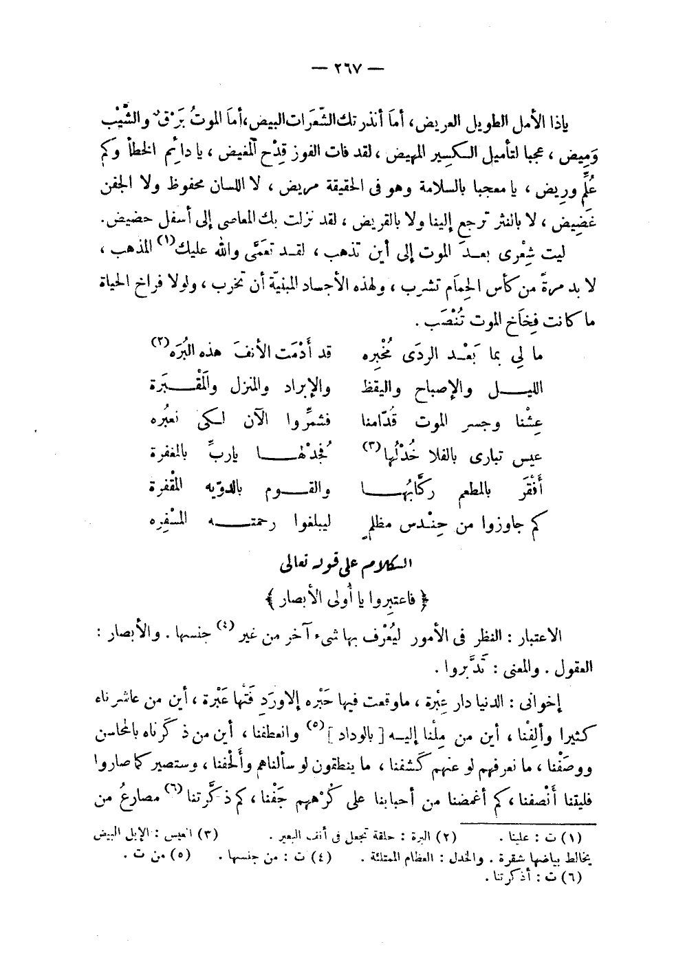 | | يا ذا الأمل الطويل العريض , أما أنذرتك الشعرات البيض , أما الموت برق والشيب | وميض , عجباً لتأميل الكسير المهيض , لقد فات الفوز قدح المغيض , يا دائم الخطأ وكم | علم وريض , يا معجباً بالسلامة وهو في الحقيقة مريض , لا اللسان محفوظ ولا الجفن | غضيض , لا بالنثر ترجع إلينا ولا بالقريض , لقد نزلت بك المعاصي إلى أسفل حضيض . | | ليت شعري بعد الموت إلى أين تذهب , لقد تعمى والله عليك المذهب , | لا بد مرة من كأس الحمام تشرب , ولهذه الأجساد المبنية أن تخرب , ولولا فراخ الحياة | ما كانت فخاخ الموت تنصب . | | ( ما لي بما بعد الردى مخبره % قد أدمت الأنف هذه البره ) % | | ( الليل والإصباح واليقظ % والإبراد والمنزل والمقبرة ) % | | ( عشنا وجسر الموت قدامنا % فشمروا الآن لكي نعبره ) % | | ( عيس تباري بالفلا خدلها % فجدلها يا رب بالمغفرة ) % | | ( أفقر بالمطعم ركابها % والقوم بالدوية المقفرة ) % | | ( كم جاوزوا من حندس مظلم % ليبلغوا رحمته المسفرة ) % | الكلام على قوله تعالى | ! 2 < فاعتبروا يا أولي الأبصار > 2 ! | الاعتبار : النظر في الأمور ليعرف بها شيء آخر من غير جنسها . والأبصار : | العقول . والمعنى : تدبروا . | | إخواني : الدنيا دار عبرة , ما وقعت فيها حبره إلا ورد فتها عبرة , أين من عاشرناه | كثيراً وألفنا , أين من ملنا إليه [ بالوداد ] وانعطفنا , أين من ذكرناه بالمحاسن | ووصفنا , ما نعرفهم لو عنهم كشفنا , ما ينطقون لو سألناهم وألحفنا , وستصير كما صاروا | فليتنا أنصفنا , كم أغمضنا من أحبابنا على كرههم جفناً , كم ذكرتنا مصارع من |