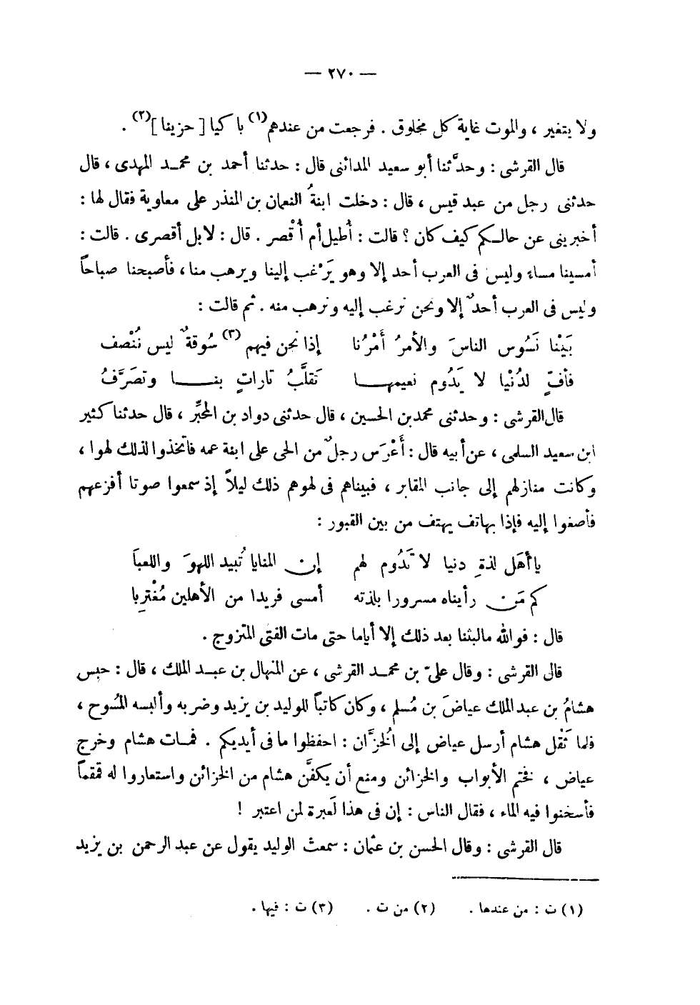| ولا يتغير والموت غاية كل مخلوق . فرجعت من عندهم باكياً [ حزيناً ] . | | قال القرشي : وحدثنا أبو سعيد المدائني قال : حدثنا أحمد بن محمد المهدي , قال | حدثني رجل من عبد قيس , قال : دخلت ابنة النعمان بن المنذر على معاوية فقال لها : | أخبريني عن حالكم كيف كان ؟ قالت : أطيل أم أقصر . قال : لا بل أقصري . قالت : | أمسينا مساء وليس في العرب أحد إلا وهو يرغب إلينا ويرهب منا , فأصبحنا صباحاً | وليس في العرب أحد إلا ونحن نرغب إليه ونرهب منه . ثم قالت : | | ( بينا نسوس الناس والأمر أمرنا % إذا نحن فيهم سوقة ليس ننصف ) % | | ( فأف لدنيا لا يدوم نعيمها % نقلب تارات بنا وتصرف ) % | | قال القرشي : وحدثني محمد بن الحسين , قال حدثني داود بن المحبر , قال حدثنا كثير | ابن سعيد السلمي , عن أبيه قال : أعرس رجل من الحي على ابنة عمه فاتخذوا لذلك لهواً , | وكانت منازلهم إلى جانب المقابر , فبيناهم في لهوهم ذلك ليلاً إذ سمعوا صوتاً أفزعهم | فأصغوا إليه فإذا بهاتف يهتف من بين القبور : | | ( يا أهل لذة دنيا لا تدوم لهم % إن المنايا تبيد اللهو واللعبا ) % | | ( كم من رأيناه مسروراً بلذته % أمسى فريداً من الأهلين مغترباً ) % | | قال : فوالله ما لبثنا بعد ذلك إلا أياماً حتى مات الفتى المتزوج . | | قال القرشي : وقال علي بن محمد القرشي . عن المنهال بن عبد الملك , قال : حبس | هشام بن عبد الملك عياض بن مسلم , وكان كاتباً للوليد بن يزيد وضربه وألبسه المسوح , | فلما ثقل هشام أرسل عياض إلى الخزان : احفظوا ما في أيديكم . فمات هشام وخرج | عياض , فختم الأبواب والخزائن ومنع أن يكفن هشام من الخزائن واستعاروا له قمقماً | فأسخنوا فيه الماء , فقال الناس : إن في هذا لعبرة لمن اعتبر ! | | قال القرشي : وقال الحسن بن عثمان : سمعت الوليد يقول عن عبد الرحمن بن يزيد