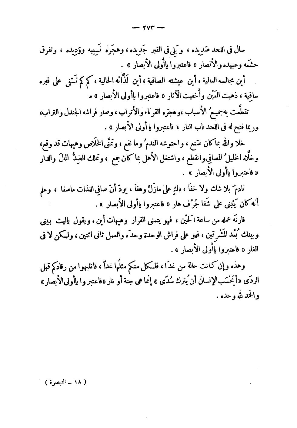 | | سال في اللحد صديده , وبلى في القبر جديده , وهجره نسيبه ووديده , وتفرق | حشمه وعبيده والأنصار ! 2 < فاعتبروا يا أولي الأبصار > 2 ! . | | أين مجالسه العالية , أين عيشته الصافية , أين لذاته الحالية , كم كم تسفى على قبره | سافية , ذهبت العين وأخفيت الآثار ! 2 < فاعتبروا يا أولي الأبصار > 2 ! . | | تقطعت به جميع الأسباب , وهجره القرناء والأتراب , وصار فراشه الجندل والتراب , | وربما فتح له في اللحد باب النار ! 2 < فاعتبروا يا أولي الأبصار > 2 ! . | | خلا والله بما كان صنع , واحتوشه الندم وما نفع , وتمنى الخلاص وهيهات قد وقع , | وخلاه الخليل المصافي وانقطع , واشتغل الأهل بما كان جمع , وتملك الضد المال والدار | ! 2 < فاعتبروا يا أولي الأبصار > 2 ! . | | نادم بلا شك ولا خفا , باك على ما زل وهفا , يود أن صافي اللذات ما صفا , وعلم | أنه كان يبني على شفا جرف هار ! 2 < فاعتبروا يا أولي الأبصار > 2 ! . | | قارنه عمله من ساعة الحين , فهو يتمنى الفرار وهيهات أين , ويقول يا ليت بيني | وبينك بعد المشرقين , فهو على فراش الوحدة وحده والعمل ثاني اثنين , ولكن لا في | الغار ! 2 < فاعتبروا يا أولي الأبصار > 2 ! . | | وهذه إن كانت حالة من غدا , فلكل منكم مثلها غداً , فانتبهوا من رقادكم قبل | الردى ! 2 < أيحسب الإنسان أن يترك سدى > 2 ! إنما هي جنة أو نار ! 2 < فاعتبروا يا أولي الأبصار > 2 ! | والحمد لله وحده . |