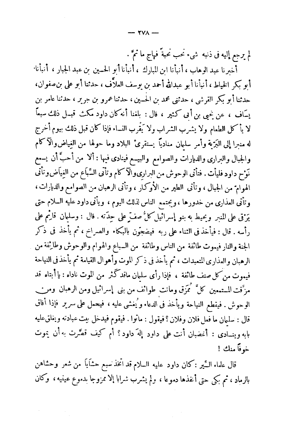 | لم يرجع إليه في ذنبه شيء نحب نحبة فهاج ما ثم . | | أخبرنا عبد الوهاب , أنبأنا ابن المبارك , أنبأنا أبو الحسين بن عبد الجبار , أنبأنا | أبو بكر الخياط , أنبأنا أبو عبد الله أحمد بن يوسف العلاف , حدثنا أبو علي بن صفوان , | حدثنا أبو بكر القرشي , حدثني محمد بن الحسين , حدثنا عمرو بن جرير , حدثنا عامر بن | يساف , عن يحيى بن أبي كثير , قال : بلغنا أنه كان داود مكث قبيل ذلك سبعا | لا يأكل الطعام ولا يشرب الشراب ولا يقرب النساء فإذا كان قبل ذلك بيوم أخرج | له منبرا إلى البرية وأمر سليمان مناديا يستقرىء البلاد وما حولها من الغياض والآكام | والجبال والبراري والديارات والصوامع والبيع فينادي فيها : ألا من أحب أن يسمع | نوح داود فليأت . فتأتي الوحوش من البراري والآكام وتأتي السباع من الغياض وتأتي | الهوام من الجبال , وتأتي الطير من الأوكار , وتأتي الرهبان من الصوامع والديارات , | وتأتي العذارى من خدورها , ويجتمع الناس لذلك اليوم , ويأتي داود عليه السلام حتى | يرقى على المنبر ويحيط به بنو إسرائيل كل صف على حدته . قال : وسليمان قائم على | رأسه . قال : فيأخذ في الثناء على ربه فيضجون بالبكاء والصراخ , ثم يأخذ في ذكر | الجنة والنار فيموت طائفة من الناس وطائفة من السباع والهوام والوحوش وطائفة من | الرهبان والعذارى المتعبدات , ثم يأخذ في ذكر الموت وأهوال القيامة ثم يأخذ في النياحة | فيموت من كل صنف طائفة , فإذا رأى سليمان ما قد كثر من الموت ناداه : يا أبتاه قد | مزقت المستمعين كل ممزق وماتت طوائف من بني إسرائيل ومن الرهبان ومن | الوحوش . فيقطع النياحة ويأخذ في الدعاء ويغشى عليه , فيحمل على سرير فإذا أفاق | قال سليمان : ما فعل فلان وفلان ؟ فيقول : ماتوا . فيقوم فيدخل بيت عبادته ويغلق عليه | بابه وينادي : أغضبان أنت على داود إله داود ؟ أم كيف قصرت به أن يموت | خوفا منك ! | | قال علماء السير : كان داود عليه السلام قد اتخذ سبع حشايا من شعر وحشاهن | بالرماد , ثم بكى حتى أنفذها دموعا , ولم يشرب شرابا إلا ممزوجا بدموع عينيه , وكان |