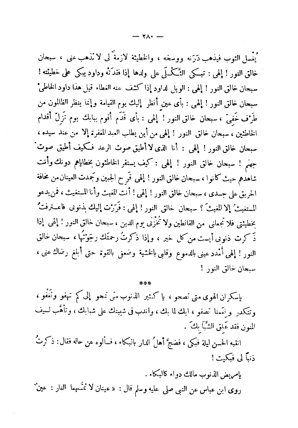 | يغسل الثوب فيذهب درنه ووسخه , والخطيئة لازمة لي لا تذهب عني , سبحان | خالق النور ! إلهي : تبكي الثكلى على ولدها إذا فقدته وداود يبكي على خطيئته ! | سبحان خالق النور ! إلهي : الويل لداود إذا كشف عنه الغطاء قيل هذا داود الخاطىء | سبحان خالق النور ! إلهي : بأي عين أنظر إليك يوم القيامة وإنما ينظر الظالمون من | طرف خفي , سبحان خالق النور ! إلهي : بأي قدم أقوم ببابك يوم تزل أقدام | الخاطئين , سبحان خالق النور ! إلهي : من أين يطلب العبد المغفرة إلا من عند سيده , | سبحان خالق النور ! إلهي : أنا الذي لا أطيق صوت الرعد فكيف أطيق صوت | جهنم ! سبحان خالق النور ! إلهي : كيف يستقر الخاطئون بخطاياهم دونك وأنت | شاهدهم حيث كانوا , سبحان خالق النور ! إلهي قرح الجبين وجمدت العينان من مخافة | الحريق على جسدي , سبحان خالق النور ! إلهي ! أنت المغيث وأنا المستغيث , فمن يدعو | المستغيث إلا المغيث ؟ سبحان خالق النور ! إلهي : فررت إليك بذنوبي فاعترفت | بخطيئتي فلا تجعلني من القانطين ولا تخزني يوم الدين , سبحان خالق النور ! إلهي إذا | ذكرت ذنوبي أيست من كل خير , وإذا ذكرت رحمتك رجوتها , سبحان خالق | النور ! إلهي أمدد عيني بالدموع وقلبي بالخشية وضعفي بالقوة حتى أبلغ رضاك عني , | سبحان خالق النور ! | | يا سكران الهوى متى تصحو , يا كثير الذنوب متى تمحو إلى كم تهفو وتغفو , | وتتكدر ونعمنا تصفو , ابك لما بك , واندب في شيبتك على شبابك , وتأهب لسيف | المنون فقد علق الشبا بك . | | انتبه الحسن ليلة فبكى , فضج أهل الدار بالبكاء , فسألوه عن حاله , فقال : ذكرت | ذنباً لي فبكيت ! | | يا مريض الذنوب مالك دواء كالبكاء . | | روى ابن عباس عن النبي صلى الله عليه وسلم قال : ' عينان لا تمسهما النار : عين |