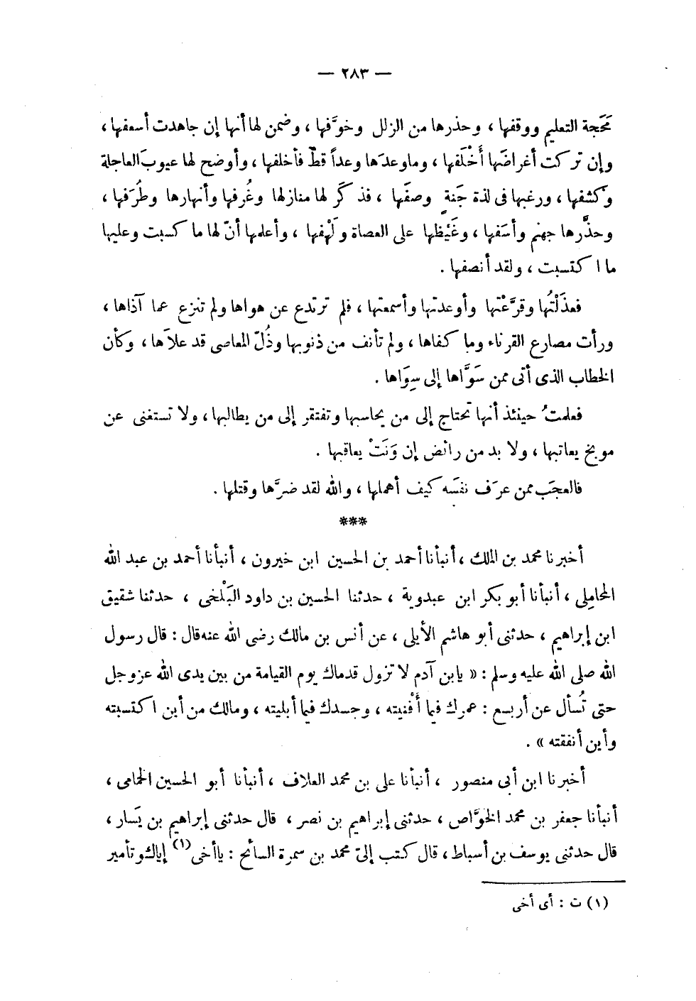 | محجة التعليم ووقفها , وحذرها من الزلل وخوفها , وضمن لها أنها إن جاهدت أسعفها , | وإن تركت أغراضها أخلفها , وما وعدها وعداً قط فأخلفها وأوضح لها عيوب العاجلة | وكشفها , ورغبها في لذة جنة وصفها , فذكر لها منزلها وغرفها وأنهارها وطرفها , | وحذرها جهنم وأسفها وغيظها على العصاة ولهفها , وأعلمها أن لها ما كسبت وعليها | ما اكتسبت , ولقد أنصفها . | | فعذلتها وقرعتها وأوعدتها وأسمعتها , فلم ترتدع عن هواها ولم تنزع عما آذاها , | ورأت مصارع القرناء وما كفاها , ولم تأنف من ذنوبها وذل المعاصي قد علاها , وكأن | الخطاب الذي أتي ممن سواها إلى سواها . | | فعلمت حينئذ أنها تحتاج إلى من يحاسبها وتفتقر إلى من يطالبها ، ولا تستغني عن | موبخ يعاتبها , ولا بد من رائض إن ونت يعاقبها . | | فالعجب ممن عرف نفسه كيف أهملها , والله لقد ضرها وقتلها . | | أخبرنا محمد بن الملك , أنبأنا أحمد بن الحسين ابن خيرون , أنبأنا أحمد بن عبد الله | المحاملي , أنبأنا أبو بكر ابن عبدوية , حدثنا الحسين بن داود البلخي , حدثنا شقيق | ابن إبراهيم , حدثني أبو هاشم الأيلي , عن أنس بن مالك رضي الله عنه قال : قال رسول | الله صلى الله عليه وسلم : ' يا ابن آدم لا تزول قدماك يوم القيامة من بين يدي الله عز وجل | حتى تسأل عن أربع : عمرك فيما أفنيته , وجسدك فيما أبليته , ومالك من أين اكتسبته | وأين أنفقته ' . | | أخبرنا ابن أبي منصور , أنبأنا علي بن محمد العلاف , أنبأنا أبو الحسين الحمامي , | أنبأنا جعفر بن محمد الخواص , حدثني إبراهيم بن نصر , قال حدثني إبراهيم بن يسار , | قال حدثني يوسف بن أسباط , قال كتب إلي محمد بن سمرة السائح : يا أخي إياك وتأمير |