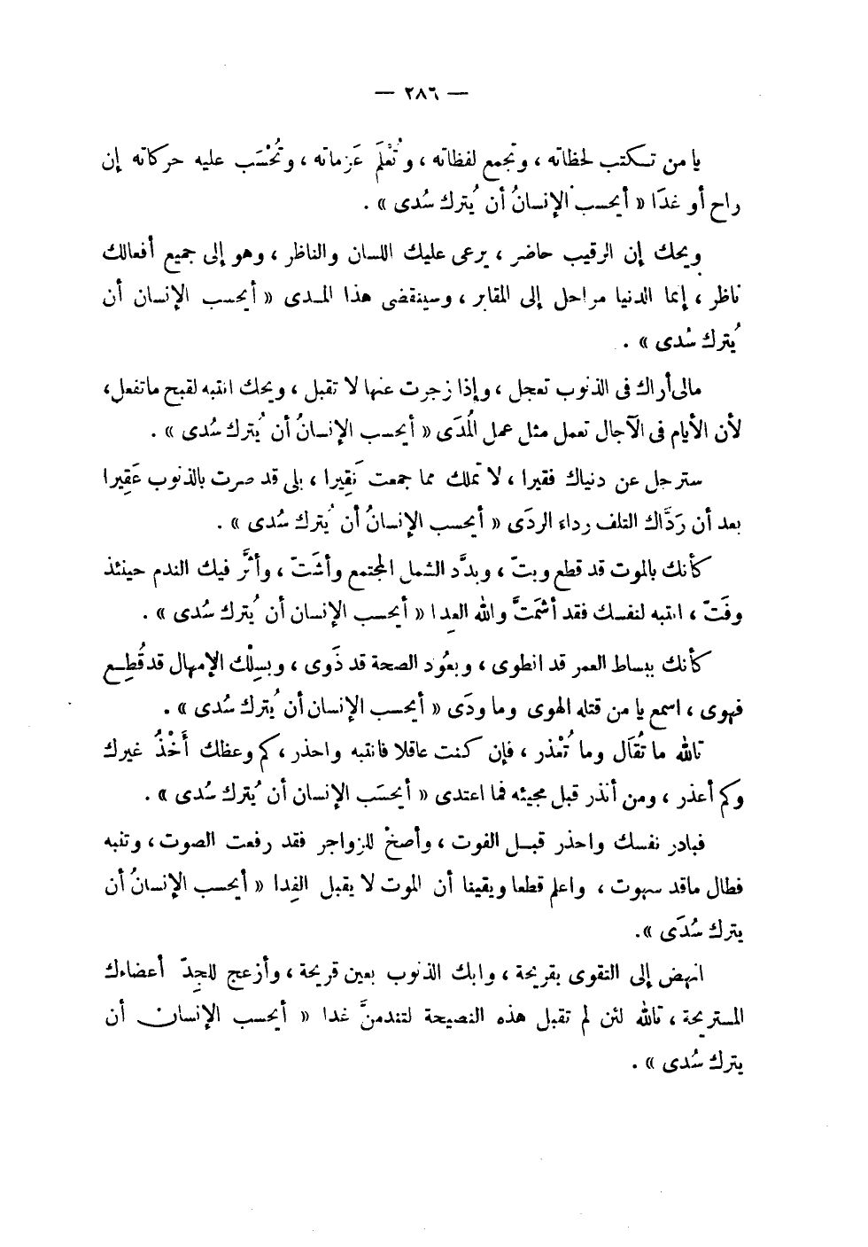 | | يا من تكتب لحظاته , وتجمع لفظاته , وتعلم عزماته , وتحسب عليه حركاته إن | راح أو غدا ! 2 < أيحسب الإنسان أن يترك سدى > 2 ! . | | ويحك إن الرقيب حاضر , يرعى عليك اللسان والناظر , وهو إلى جميع أفعالك | ناظر , إنما الدنيا مراحل إلى المقابر , وسينقضي هذا المدى ! 2 < أيحسب الإنسان أن يترك سدى > 2 ! . | | مالي أراك في الذنوب تعجل , وإذا زجرت عنها لا تقبل , ويحك انتبه لقبح ما تفعل , | لأن الأيام في الآجال تعمل مثل عمل المدى ! 2 < أيحسب الإنسان أن يترك سدى > 2 ! . | | سترحل عن دنياك فقيرا , لا تملك مما جمعت نقيرا , بلى قد صرت بالذنوب عقيرا | بعد أن رداك التلف رداء الردى ! 2 < أيحسب الإنسان أن يترك سدى > 2 ! . | | كأنك بالموت قد قطع وبت , وبدد الشمل المجتمع وأشت , وأثر فيك الندم حينئذ | وفت , انتبه لنفسك فقد أشمتّ والله العدا ! 2 < أيحسب الإنسان أن يترك سدى > 2 ! . | | كأنك ببساط العمر قد انطوى , وبعود الصحة قد ذوى , وبسلك الإمهال قد قطع | فهوى , اسمع يا من قتله الهوى وما ودى ! 2 < أيحسب الإنسان أن يترك سدى > 2 ! . | | تالله ما تقال وما تعذر , فإن كنت عاقلاً فانتبه واحذر , كم وعظك أخذ غيرك | وكم أعذر , ومن أنذر قبل مجيئه فما اعتدى ! 2 < أيحسب الإنسان أن يترك سدى > 2 ! . | | فبادر نفسك واحذر قبل الفوت , وأصخ للزواجر فقد رفعت الصوت , وتنبه | فطال ما قد سهوت , واعلم قطعاً ويقيناً أن الموت لا يقبل الفدا ! 2 < أيحسب الإنسان أن يترك سدى > 2 ! . | | انهض إلى التقوى بقريحة , وابك الذنوب بعين قريحة , وأزعج للجد أعضاءك | المستريحة , تالله لئن لم تقبل هذه النصيحة لتندمن غدا ! 2 < أيحسب الإنسان أن يترك سدى > 2 ! . |