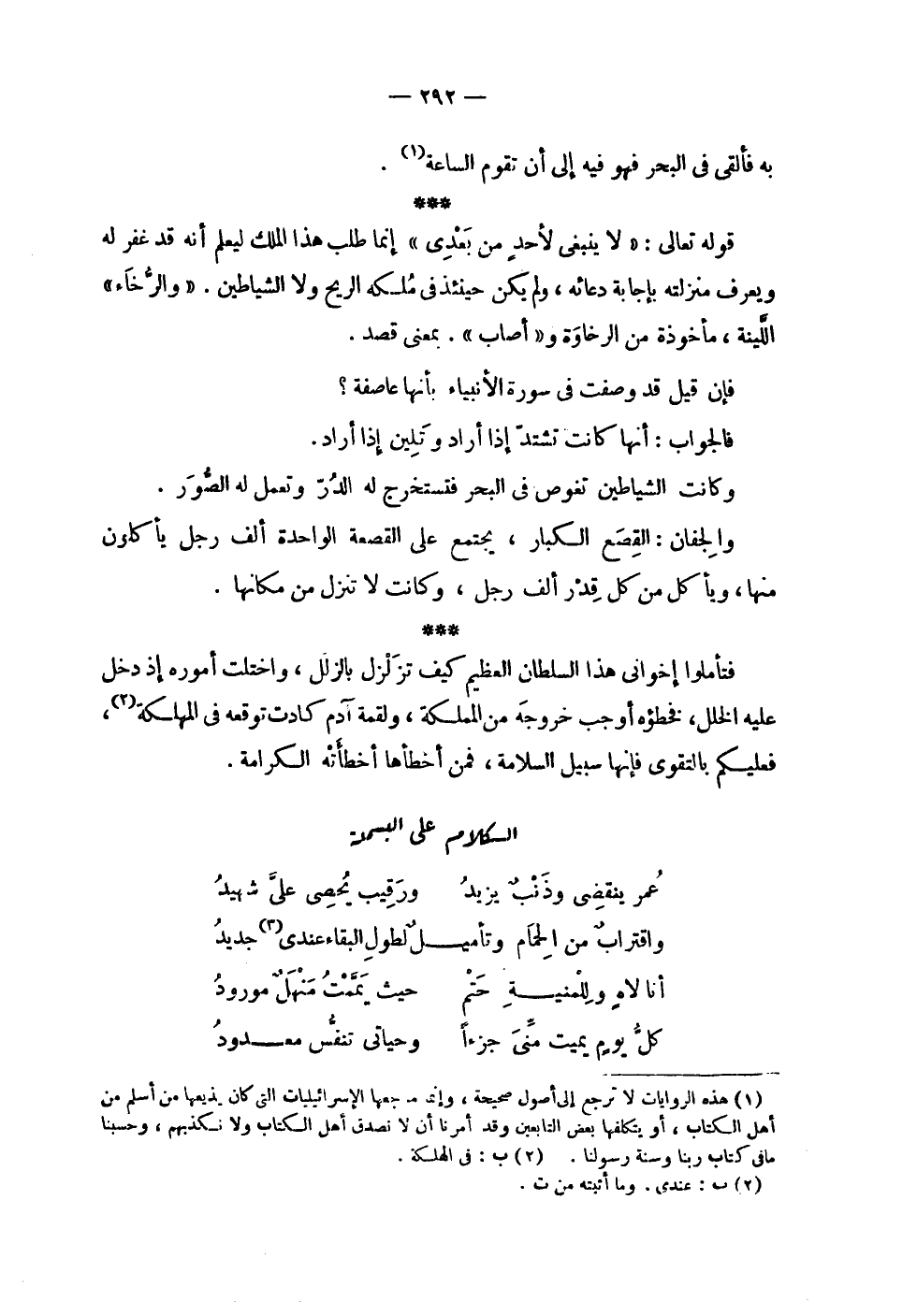 | به فألقي في البحر فهو فيه إلى أن تقوم الساعة . | | قوله تعالى : ! 2 < لا ينبغي لأحد من بعدي > 2 ! إنما طلب هذا الملك ليعلم أنه قد غفر له | ويعرف منزلته بإجابة دعائه , ولم يكن حينئذ في ملكه الريح ولا الشياطين . ^ ( والرخاء ) ^ | اللينة , مأخوذة من الرخاوة و ! 2 < أصاب > 2 ! . بمعنى قصد . | | فإن قيل قد وصفت في سورة الأنبياء بأنها عاصفة ؟ | | فالجواب : أنها كانت تشتد إذا أراد وتلين إذا أراد . | | وكانت الشياطين تغوص في البحر فتستخرج له الدر وتعمل له الصور . | | والجفان : القصع الكبار , يجتمع على القصعة الواحدة ألف رجل يأكلون | منها , ويأكل من كل قدر ألف رجل , وكانت لا تنزل من مكانها . | | فتأملوا إخواني هذا السلطان العظيم كيف تزلزل بالزلل , واختلت أموره إذ دخل | عليه الخلل , فخطؤه أوجب خروجه من المملكة , ولقمة آدم كادت توقعه في المهلكة , | فعليكم بالتقوى فإنها سبيل السلامة , فمن أخطأها أخطأته الكرامة . | الكلام على البسملة | | ( عمر ينقضي وذنب يزيد % ورقيب يحصى على شهيد ) % | | ( واقتراب من الحمام وتأميل % لطول البقاء عندي جديد ) % | | ( أنا لاه وللمنية حتم % حيث يممت منهل مورود ) % | | ( كل يوم يميت مني جزءاً % وحياتي تنفس معدود ) % |