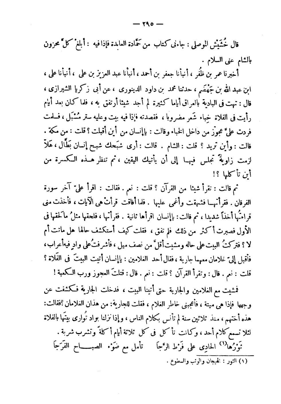 | | قال خشيش الموصلي : جاءني كتاب من حمادة العابدة فإذا فيه : أبلغ كل محزون | بالشام عني السلام . | | أخبرنا عمر بن ظفر , أنبأنا جعفر بن أحمد , أنبأنا عبد العزيز بن علي , بن أنبأنا علي , | ابن عبد الله بن جهضم , حدثنا محمد بن داود الدينوري , عن أبي زكريا الشيرازي , | قال : تهت في البادية بالعراق أياماً كثيرة ولم أجد شيئا أرتفق به ، فلما كان بعد ثلاثة أيام | رأيت في الفلاة خباء شعر مضروباً , فقصدته فإذا فيه بيت وعليه ستر مسبل , فسلمت | فردت علي عجوز من داخل الخباء وقالت : يا إنسان من أين أقبلت ؟ قلت : من مكة . | قالت : وأين تريد ؟ قلت : الشام . قالت : أرى شبحك شبح إنسان بطال , هلا | لزمت زاوية تجلس فيها إلى أن يأتيك اليقين , ثم تنظر هذه الكسرة من | أين تأكلها ؟ ! | | ثم قالت : تقرأ شيئاً من القرآن ؟ قلت : نعم . فقالت : اقرأ علي آخر سورة | الفرقان . فقرأتها فشهقت وأغمي عليها . فلما أفاقت قرأت هي الآيات , فأخذت مني | قراءتها أخذاً شديداً , ثم قالت : يا إنسان اقرأها ثانية . فقرأتها , فلحقها مثل ما لحقها في | الأول فصبرت أكثر من ذلك فلم تفق , فقلت كيف أستكشف حالها هل ماتت أم | لا ؟ فتركت البيت على حاله ومشيت أقل من نصف ميل , فأشرفت على واد فيه أعراب , | فأقبل إلي غلامان معهما جارية , فقال أحد الغلامين : يا إنسان أتيت البيت في الفلاة ؟ | قلت : نعم . قال : وتقرأ القرآن ؟ قلت : نعم . قال : قتلت العجوز ورب الكعبة ! | | فمشيت مع الغلامين والجارية حتى أتينا البيت , فدخلت الجارية فكشفت عن | وجهها فإذا هي ميتة , فأعجبني خاطر الغلام , فقلت للجارية : من هذان الغلامان ؟ فقالت : | هذه أختهم , منذ ثلاثين سنة لم تأنس بكلام الناس , وإذا نزلنا بواد توارى بيتها بالفلاة | لئلا تسمع كلام أحد , وكانت تأكل في كل ثلاثة أيام أكلة وتشرب شربة . | | ( ثورها الحادي على فرط الرجا % تأمل مع ضوء الصباح الفرجا ) % |