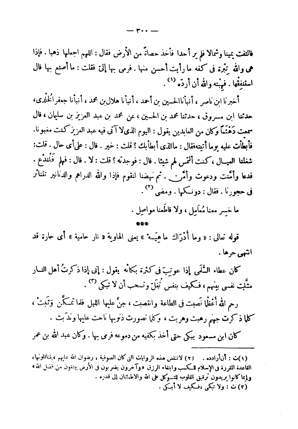 | فالتفت يميناً وشمالاً فلم ير أحداً فأخذ حصاة من الأرض فقال : اللهم اجعلها ذهبا . فإذا | هي والله تبرة في كفه ما رأيت أحسن منها . فرمى بها إلي فقلت : ما أصنع بها قال | استنفقها . فهبته والله أن أرده . | | أخبرنا ابن ناصر , أنبأنا الحسين بن أحمد , أنبأنا هلال بن محمد , أنبأنا جعفر الخلدي , | حدثنا ابن مسروق , حدثنا محمد بن الحسين , عن محمد بن عبد العزيز بن سليمان , قال : | سمعت دهثماً وكان من العابدين يقول : اليوم الذي لا آتي فيه عبد العزيز كنت مغبوناً . | فأبطأت عليه يوما أتيته فقال : ما الذي أبطأ بك ؟ قلت : خير . قال : على أي حال . قلت : | شغلنا العيال , كنت ألتمس لهم شيئاً . قال : فوجدته ؟ قلت : لا . قال : فهلم فلندع . | فدعا وأمّنت ودعوت وأمّن . ثم نهضنا لنقوم فإذا والله الدراهم والدنانير تتناثر | في حجورنا . فقال : دونكها . ومضى . | | ما خسر معنا معامل , ولا قاطعنا مواصل . | | قوله تعالى : ! 2 < وما أدراك ما هيه > 2 ! يعني الهاوية ! 2 < نار حامية > 2 ! أي حارة قد | انتهى حرها . | | كان عطاء السلمي إذا عوتب في كثرة بكائه يقول : إني إذا ذكرت أهل النار | مثلت نفسي بينهم , فكيف بنفس تغل وتسحب أن لا تبكي . | | رحم الله أعظماً نصبت في الطاعة وانتصبت , جن عليها الليل فلما تمكن وثبت , | كلما ذكرت جهنم رهبت وهربت , وكلما تصورت ذنوبها ناحت عليها وندبت . | | كان ابن مسعود يبكي حتى أخذ بكفيه من دموعه فرمى بها . وكان عبد الله بن عمر |