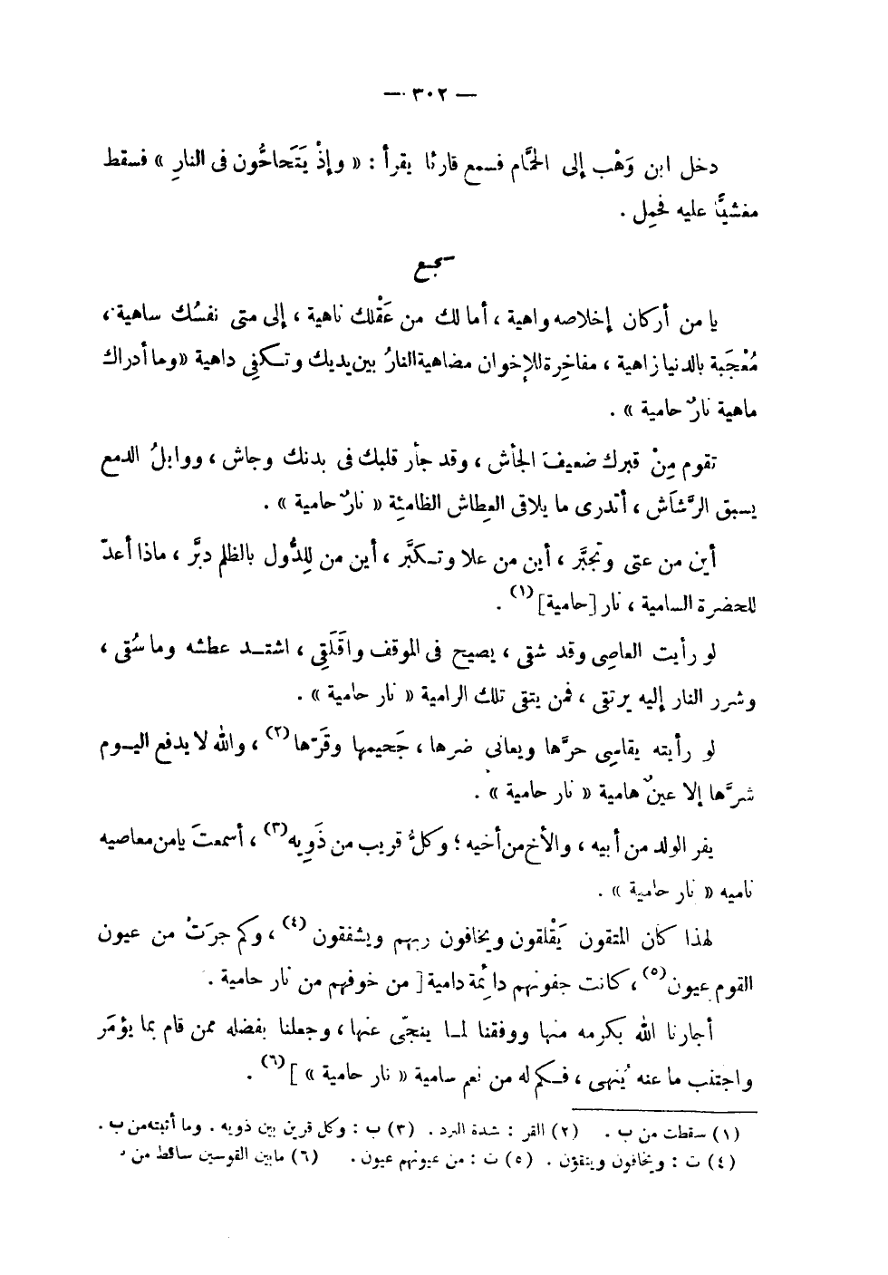 | | دخل ابن وهب إلى الحمام فسمع قارئاً يقرأ : ! 2 < وإذ يتحاجون في النار > 2 ! فسقط | مغشياً عليه فحمل . | سجع | | يا من أركان إخلاصه واهية , أما لك من عقلك ناهية , إلى متى نفسك ساهية , | معجبة بالدنيا زاهية , مفاخرة للإخوان مضاهية النار بين يديك وتكفي داهية ^ ( وما أدراك | ما هي نار حامية ) ^ . | | تقوم من قبرك ضعيف الجأش , وقد جأر قلبك في بدنك وجاش , ووابل الدمع | يسبق الرشاش , أتدري ما يلاقي العطاش الظامئة ! 2 < نار حامية > 2 ! . | | أين من عتى وتجبر , أين من علا وتكبر , أين من للدول بالظلم دبر , ماذا أعد | للحضرة السامية , نار [ حامية ] . | | لو رأيت العاصي وقد شقى , يصيح في الموقف واقلقي , اشتد عطشه وما سقى , | وشرر النار إليه يرتقي , فمن يتقي تلك الرامية ! 2 < نار حامية > 2 ! . | | لو رأيته يقاسي حرها ويعاني ضرها , جحيمها وقرها , والله لا يدفع اليوم | شرها إلا عين هامية ! 2 < نار حامية > 2 ! . | | يفر الولد من أبيه , والأخ من أخيه ؛ وكل قريب من ذويه , أسمعت يا من معاصيه | ناميه ! 2 < نار حامية > 2 ! . | | لهذا كان المتقون يقلقون ويخافون ربهم ويشفقون , وكم جرت من عيون | القوم عيون , كانت جفونهم دائمة دامية [ من خوفهم من نار حامية . | | أجارنا الله بكرمه منها ووفقنا لما ينجي عنها , وجعلنا بفضله ممن قام بما يؤمر | واجتنب ما عنه ينهى , فكم له من نعم سامية ! 2 < نار حامية > 2 ! ] . |