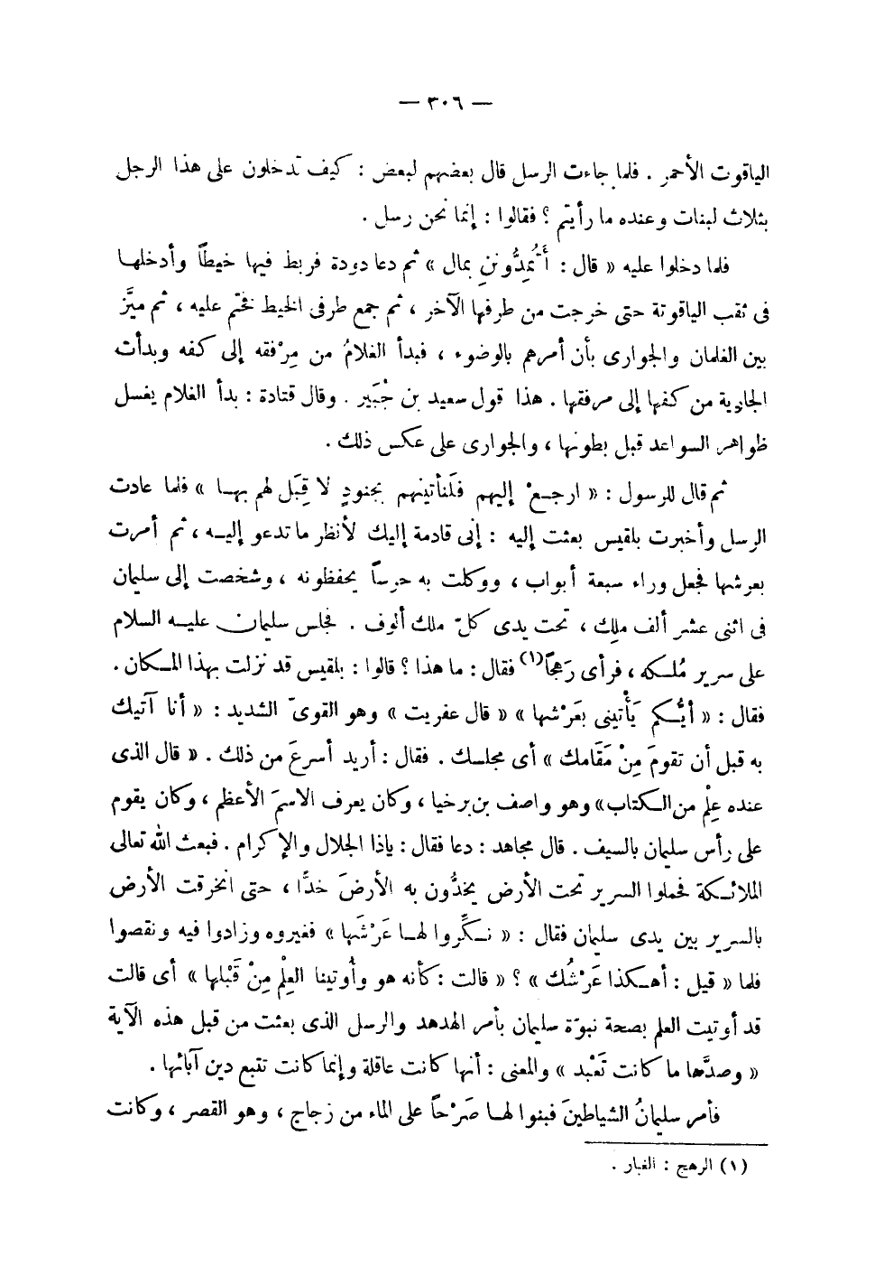 | الياقوت الأحمر . فلما جاءت الرسل قال بعضهم لبعض : كيف تدخلون على هذا الرجل | بثلاث لبنات وعنده ما رأيتم ؟ فقالوا : إنما نحن رسل . | | فلما دخلوا عليه ! 2 < قال أتمدونن بمال > 2 ! ثم دعا دودة فربط فيها خيطاًَ وأدخلها | في ثقب الياقوتة حتى خرجت من طرفها الآخر , ثم جمع طرفي الخيط فختم عليه , ثم ميز | بين الغلمان والجواري بأن أمرهم بالوضوء , فبدأ الغلام من مرفقه إلى كفه وبدأت | الجارية من كفها إلى مرفقها . هذا قول سعيد بن جبير . وقال قتادة : بدأ الغلام يغسل | ظواهر السواعد قبل بطونها , والجواري على عكس ذلك . | | ثم قال للرسول : ! 2 < ارجع إليهم فلنأتينهم بجنود لا قبل لهم بها > 2 ! فلما عادت | الرسل وأخبرت بلقيس بعثت إليه : إني قادمة إليك لأنظر ما تدعو إليه , ثم أمرت | بعرشها فجعل وراء سبعة أبواب , ووكلت به حرساً يحفظونه , وشخصت إلى سليمان | في اثني عشر ألف ملك , تحت يدي كل ملك ألوف . فجلس سليمان عليه السلام | على سرير ملكه , فرأى رهجاً فقال : ما هذا ؟ قالوا : بلقيس قد نزلت بهذا المكان . | فقال : ! 2 < أيكم يأتيني بعرشها > 2 ! ! 2 < قال عفريت > 2 ! وهو القوي الشديد : ! 2 < أنا آتيك به قبل أن تقوم من مقامك > 2 ! أي مجلسك . فقال : أريد أسرع من ذلك . ! 2 < قال الذي عنده علم من الكتاب > 2 ! وهو واصف بن برخيا , وكان يعرف الاسم الأعظم , وكان يقوم | على رأس سليمان بالسيف . قال مجاهد : دعا فقال : يا ذا الجلال والإكرام . فبعث الله تعالى | الملائكة فحملوا السرير تحت الأرض يخدون به الأرض خداً , حتى انخرقت الأرض | بالسرير بين يدي سليمان فقال : ! 2 < نكروا لها عرشها > 2 ! فغيروه وزادوا فيه ونقصوا | فلما ! 2 < قيل أهكذا عرشك > 2 ! ؟ ' قالت : كأنه هو وأوتينا العلم من قبلها ' أي قالت | قد أوتيت العلم بصحة نبوة سليمان بأمر الهدهد والرسل الذي بعثت من قبل هذه الآية | ! 2 < وصدها ما كانت تعبد > 2 ! والمعنى : أنها كانت عاقلة وإنما كانت تتبع دين آبائها . | | فأمر سليمان الشياطين فبنوا لها صرحاً على الماء من زجاج , وهو القصر , وكانت |