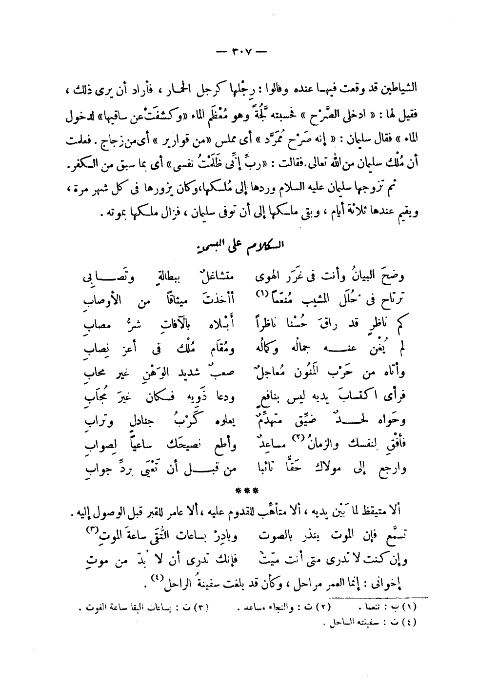 | الشياطين قد وقعت فيها عنده وقالوا : رجلها كرجل الحمار , فأراد أن يرى ذلك , | فقيل لها : ! 2 < ادخلي الصرح > 2 ! فحسبته لجة وهو معظم الماء ! 2 < وكشفت عن ساقيها > 2 ! لدخول | الماء فقال سليمان : ! 2 < إنه صرح ممرد > 2 ! أي مملس ! 2 < من قوارير > 2 ! أي من زجاج . فعلمت | أن ملك سليمان من الله تعالى . فقالت : ! 2 < رب إني ظلمت نفسي > 2 ! أي بما سبق من الكفر . | | ثم تزوجها سليمان عليه السلام وردها إلى ملكها , وكان يزورها في كل شهر مرة , | ويقيم عندها ثلاثة أيام , وبقي ملكها إلى أن توفي سليمان , فزال ملكها بموته . | الكلام على البسملة | | ( وضح البيان وأنت في غرر الهوى % متشاغل ببطالة وتصابي ) % | | ( ترتاح في حلل المشيب منعماً % أأخذت ميثاقاً من الأوصاب ) % | | ( كم ناظر قد راق حسناً ناظراً % أبلاه بالآفات شر مصاب ) % | | ( لم يغن عنه جماله وكماله % ومقام ملك في أعز نصاب ) % | | ( وأتاه من حرب المنون معاجل % صعب شديد الوهن غير محاب ) % | | ( فرأى اكتساب يديه ليس بنافع % ودعا ذويه فكان غير مجاب ) % | | ( وحواه لحد ضيق متهدم % يعلوه كرب جنادل وتراب ) % | | ( فأفق لنفسك والزمان مساعد % وأطع نصيحك ساعياً لصواب ) % | | ( وارجع إلى مولاك حقاً تائباً % من قبل أن تعيي برد جواب ) % | | ألا متيقظ لما بين يديه , ألا متأهب للقدوم عليه , ألا عامر للقبر قبل الوصول إليه . | | ( تسمع فإن الموت ينذر بالصوت % وبادر بساعات التقى ساعة الموت ) % | | ( وإن كنت لا تدري متى أنت ميت % فإنك تدري أن لا بد من موت ) % | | إخواني : إنما العمر مراحل , وكأن قد بلغت سفينة الراحل . |