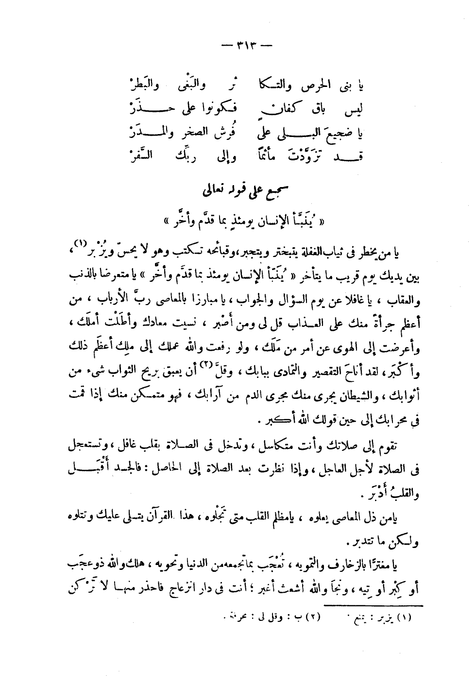 | | ( يا بني الحرص والتكاثر % والبغي والبطر ) % | | ( ليس باق كفان % فكونوا على حذر ) % | | ( يا ضجيع البلى على % فرش الصخر والمدر ) % | | ( قد تزودت مأثماً % وإلى ربك السفر ) % | سجع على قوله تعالى | ! 2 < ينبأ الإنسان يومئذ بما قدم وأخر > 2 ! | يا من يخطر في ثياب الغفلة يتبختر ويتجبر , وقبائحه تكتب وهو لا يحس ويزبر , | بين يديك يوم قريب ما يتأخر ! 2 < ينبأ الإنسان يومئذ بما قدم وأخر > 2 ! يا متعرضا بالذنب | والعقاب , يا غافلاً عن يوم السؤال والجواب , يا مبارزاً بالمعاصي رب الأرباب , من | أعظم جرأة منك على العذاب قل لي ومن أصبر , نسيت معادك وأطلت أملك , | وأعرضت إلى الهوى عن أمر من ملك , ولو رفعت والله عملك إلى ملك أعظم ذلك | وأكبر , لقد أناح التقصير والتمادي ببابك , وقل أن يعيق بريح الثواب شيء من | أثوابك , والشيطان يجري منك مجرى الدم من آرابك , فهو متمكن منك إذا قمت | في محرابك إلى حين قولك الله أكبر . | | تقوم إلى صلاتك وأنت متكاسل , وتدخل في الصلاة بقلب غافل , وتستعجل | في الصلاة لأجل العاجل , وإذا نظرت بعد الصلاة إلى الحاصل : فالجسد أقبل | والقلب أدبر . | | يا من ذل المعاصي يعلوه , يا مظلم القلب متى تجلوه , هذا القرآن يتلى عليك وتتلوه | ولكن ما تتدبر . | | يا مغتراً بالزخارف والتمويه , تعجب بما تجمعه من الدنيا وتحويه , هلك والله ذو عجب | أو كبر أو تيه , ونجا والله أشعث أغبر ؛ أنت في دار انزعاج فاحذر منها لا تركن |