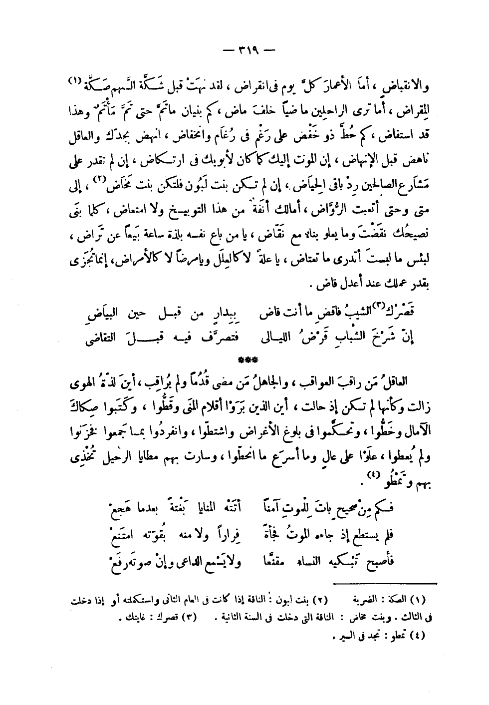 | والإنقباض , أما الأعمار كل يوم في انقراض , لقد نهت قبل شكة السهم صكة | المقراض , أما ترى الراحلين ماضياً خلف ماض , كم بنيات ما تم حتى تم مأتم وهذا | قد استفاض , كم حط ذو خفض على رغم في رغام وانخفاض , انهض بجدك والعاقل | ناهض قبل الإنهاض , إن الموت إليك كما كان لأبويك في ارتكاض , إن لم تقدر على | مشارع الصالحين رد باقي الحياض , إن لم تكن بنت لبون فلتكن بنت مخاض , إلى | متى أو حتى أتعبت الرواض , أمالك أنفة من هذا التوبيح ولا امتعاض , كما بنى | نصيحك نقضت وما يعلو بناء مع نقاض , يا من باع نفسه بلذة ساعة بيعاً عن تراض , | لبئس ما لبست أتدري ما تعتاض , يا علة لا كالعلل ويا مرضاً لا كالأمراض , إنما تجزى | بقدر عملك عند أعدل قاض . | | ( قصرك الشيب فاقض ما أنت قاض % ببدار من قبل حين البياض ) % | | ( إن شرخ الشباب قرض الليالي % فتصرف فيه قبل التقاضي ) % | | العاقل من راقب العواقب , والجاهل من مضى قدماً ولم يراقب , أين لذة الهوى | زالت وكأنها لم تكن إذ حالت , أين الذين بروا أقلام المنى وقطوا , وكتبوا صكاك | الآمال وخطوا , وتحكموا في بلوغ الأغراض واشتطوا , وانفردوا بما جمعوا فخزنوا | ولم يعطوا , علوا على عال وما أسرع ما انحطوا , وسارت بهم مطايا الرحيل تخذي | بهم وتمطو . | | ( فكم من صحيح بات للموت آمناً % أتته المنايا بغتة بعدما هجع ) % | | ( فلم يستطع إذ جاءه الموت فجأة % فراراً ولا منه بقوته امتنع ) % | | ( فأصبح تبكيه النساء مقنعاً % ولا يسمع الداعي وإن صوته رفع ) % |