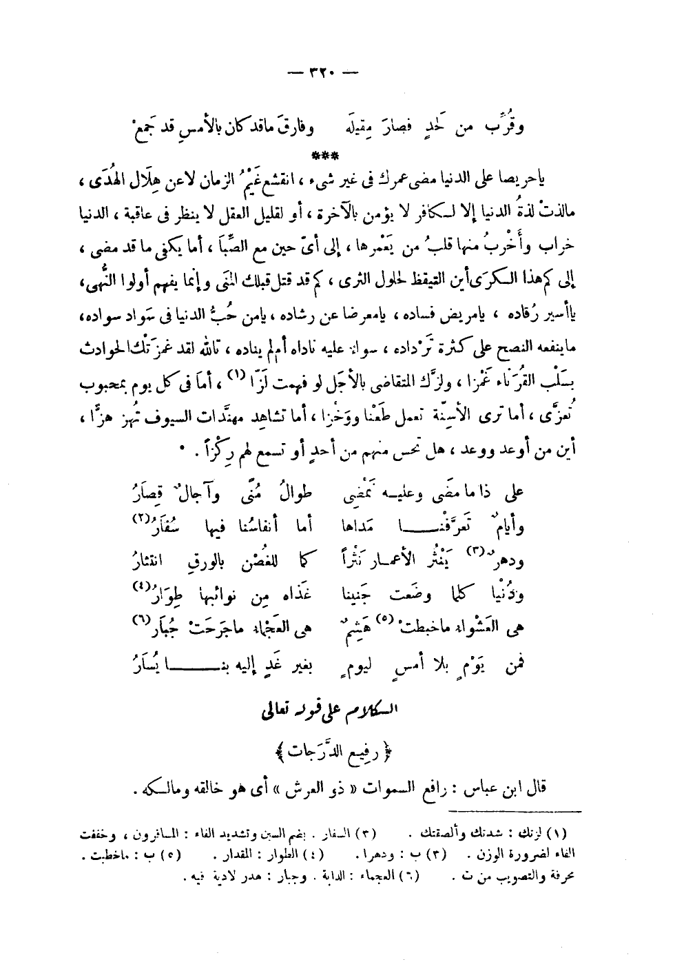 | | ( وقرب من لحد فصار مقيله % وفارق ما قد كان بالأمس قد جمع ) % | | يا حريصاً على الدنيا مضى عمرك في غير شيء ، انقشع غيم الزمان لا عن هلال الهدى , | ما لذت لذة الدنيا إلا لكافر لا يؤمن بالآخرة , أو لقليل العقل لا ينظر في عاقبة , الدنيا | خراب وأخرب منها قلب من يعمرها , إلى أي حين مع الصبا , أما يكفي ما قد مضى , | إلى كم هذا الكرى أين التيقظ لحلول الثرى , كم قد قتل قبلك المنى وإنما يفهم أولوا النهى , | يا أسير رقاده , يا مريض فساده ، يا معرضاً عن رشاده , يا من حب الدنيا في سواد سواده , | ما ينفعه النصح على كثرة ترداده , سواء عليه ناداه أم لم يناده , تالله لقد غمزتك الحوادث | بسلب القرناء غمزا , ولزك المتقاضي بالأجل لو فهمت لزا , أما في كل يوم بمحبوب | تعزى , أما ترى الأسنة تعمل طعناً ووخزاً , أما تشاهد مهندات السيوف تهز هزاً , | أين من أوعد ووعد , هل تحس منهم من أحد أو تسمع لهم ركزاً . | | ( على ذا ما مضى وعليه نمضي % طوال منى وآجال قصار ) % | | ( وأيام تعرفنا مداها % أما أنفاسنا فيها سفار ) % | | ( ودهر ينثر الأعمار نثراً % كما للغصن بالورق انتثار ) % | | ( ودنيا كلما وضعت جنيناً % غذاه من نوائبها طوار ) % | | ( هي العشواء ما خبطت هشم % هي العجماء ما جرحت جبار ) % | | ( فمن يوم بلا أمس ليوم % بغير غد إليه بنا يسار ) % | الكلام على قوله تعالى | ! 2 < رفيع الدرجات > 2 ! | قال ابن عباس : رافع السموات ! 2 < ذو العرش > 2 ! أي هو خالقه ومالكه . |
