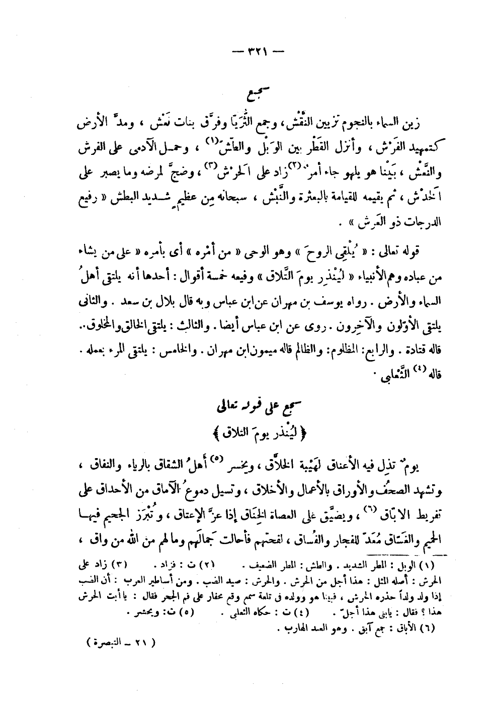 | سجع | | زين السماء بالنجوم تزيين النقش , وجمع الثريا وفرق بنات نعش , ومد الأرض | كتمهيد الفرش , وأنزل القطر بين الوبل والطش , وحمل الآدمي على الفرش | والنعش , بينا هو يلهو جاء أمر زاد على الحرش , وضج لمرضه وما يصبر على | الخدش , ثم يقيمه للقيامة بالبعثرة والنبش , سبحانه من عظيم شديد البطش ! 2 < رفيع الدرجات ذو العرش > 2 ! . | | قوله تعالى : ! 2 < يلقي الروح > 2 ! وهو الوحي ! 2 < من أمره > 2 ! أي بأمره ! 2 < على من يشاء من عباده > 2 ! وهم الأنبياء ! 2 < لينذر يوم التلاق > 2 ! وفيه خمسة أقوال : أحدها أنه يلتقي أهل | السماء والأرض . رواه يوسف بن مهران عن ابن عباس وبه قال بلال بن سعد . والثاني | يلتقي الأولون والآخرون . روى عن ابن عباس أيضاً . والثالث : يلتقي الخالق والمخلوق . | قاله قتادة . والرابع : المظلوم : والظالم قاله ميمون ابن مهران . والخامس : يلتقي المرء بعمله . | قاله الثعلبي . | سجع على قوله تعالى | ! 2 < لينذر يوم التلاق > 2 ! | يوم تذل فيه الأعناق لهيبة الخلاق , ويخسر أهل الشقاق بالرياء والنفاق , | وتشهد الصحف والأوراق بالأعمال والأخلاق , وتسيل دموع الآماق من الأحداق على | تفريط الأباق , ويضيق على العصاة الخناق إذا عز الإعتاق , وتبرز الجحيم فيها | الحميم والغساق معد للفجار والفساق , لفحتهم فأحالت جمالهم وما لهم من الله من واق , |