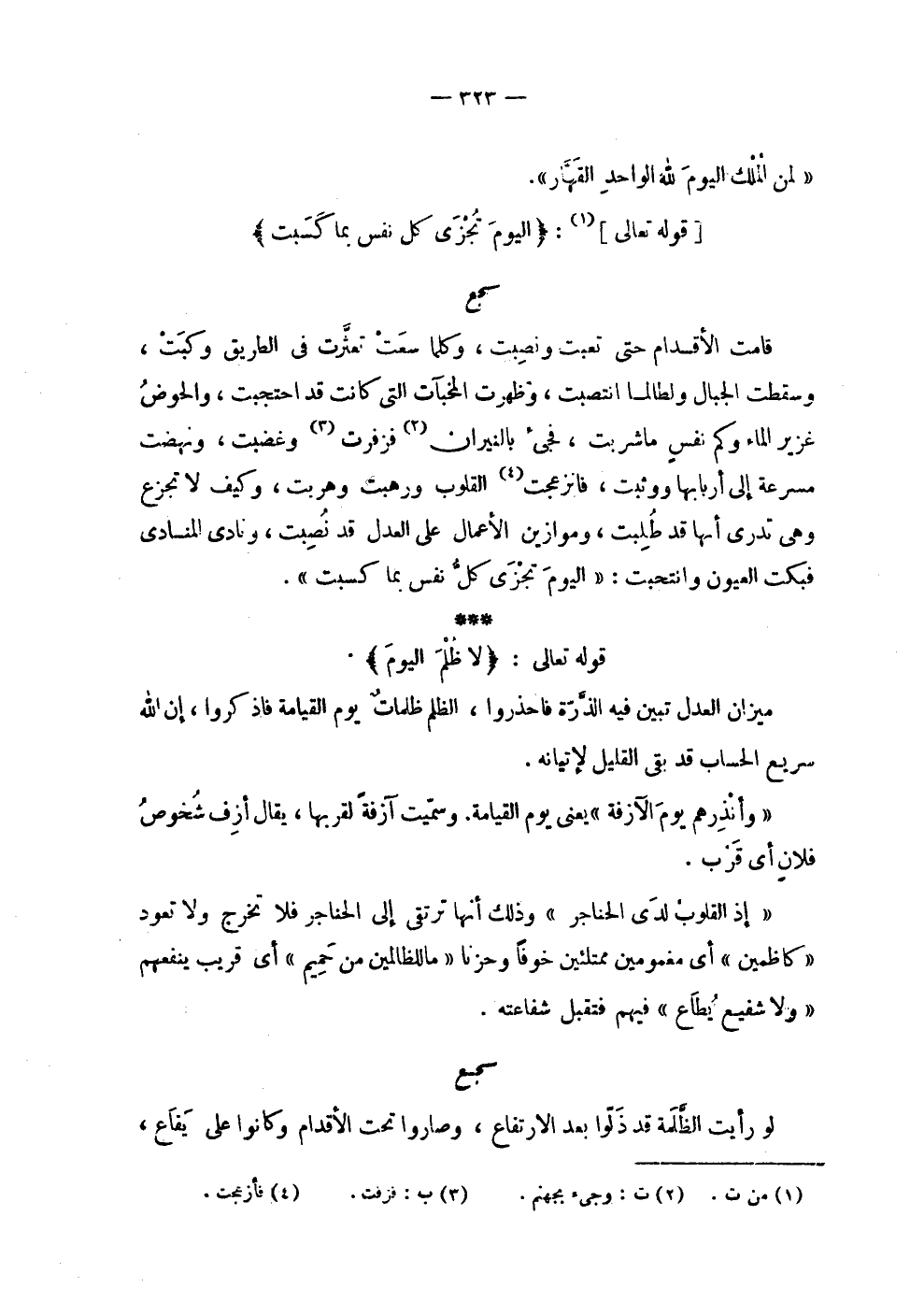 | ! 2 < لمن الملك اليوم لله الواحد القهار > 2 ! . | | [ قوله تعالى ] : ! 2 < اليوم تجزى كل نفس بما كسبت > 2 ! . | سجع | | قامت الأقدام حتى تعبت ونصبت , وكلما سعت تعثرت في الطريق وكبت , | وسقطت الجبال ولطالما انتصبت , وظهر المخبآت التي كانت قد احتجبت , والحوض | غزير الماء وكم نفس ما شربت , فجيء بالنيران فزفرت وغضبت , ونهضت | مسرعة إلى أربابها ووثبت , فانزعجت القلوب ورهبت وهربت , وكيف لا تجزع | وهي تدري أنها قد طلبت , وموازين الأعمال على العدل قد نصبت , ونادى المنادي | فبكت العيون وانتحبت : ! 2 < اليوم تجزى كل نفس بما كسبت > 2 ! . | قوله تعالى : ! 2 < لا ظلم اليوم > 2 ! | ميزان العدل تبين فيه الذرة فاحذروا , الظلم ظلمات يوم القيامة فاذكروا , إن الله | سريع الحساب قد بقي القليل لإتيانه . | | ! 2 < وأنذرهم يوم الآزفة > 2 ! يعني يوم القيامة . وسميت آزفة لقربها , يقال أزف شخوص | فلان أي قرب . | | ^ ( إذا القلوب لدى الحناجر ) ^ وذلك أنها ترتقي إلى الحناجر فلا تخرج ولا تعود | ! 2 < كاظمين > 2 ! أي مغمومين ممتلئين خوفاً وحزناً ! 2 < ما للظالمين من حميم > 2 ! أي قريب ينفعهم | ! 2 < ولا شفيع يطاع > 2 ! فيهم فتقبل شفاعته . | سجع | | لو رأيت الظلمة قد ذلوا بعد الارتفاع , وصاروا تحت الأقدام وكانوا على يقاع , |