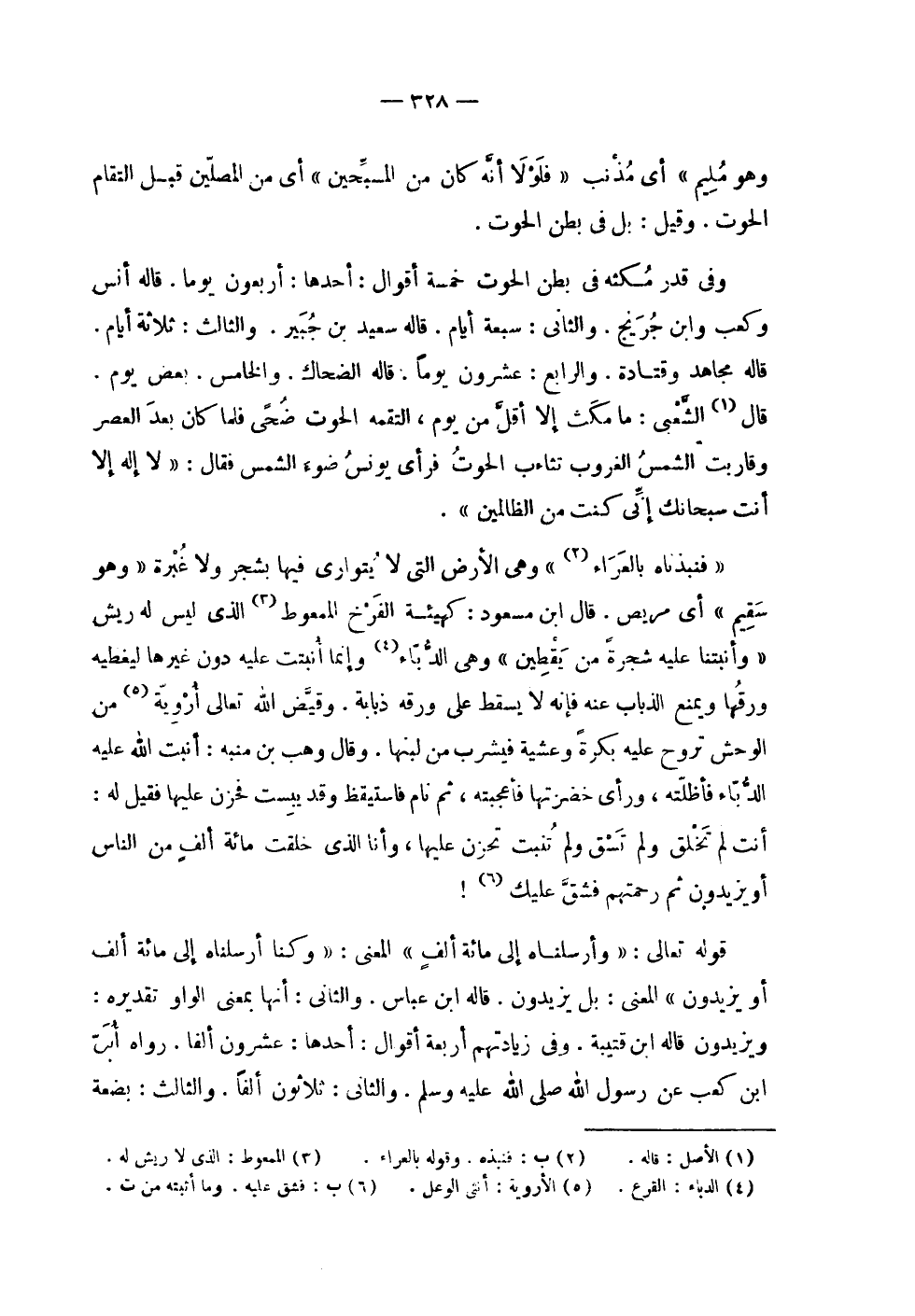 | وهو مليم ) ^ أي مذنب ^ ( فلولا أنه كان من المسبحين ) ^ أي من المصلين قبل التقام | الحوت . وقيل : بل في بطن الحوت . | | وفي قدر مكثه في بطن الحوت خمسة أقوال : أحدها : أربعون يوماً . قاله أنس | وكعب وابن جريج . والثاني : سبعة أيام . قاله سعيد بن جبير . والثالث : ثلاثة أيام . | قاله مجاهد وقتادة . والرابع : عشرون يوماً . قاله الضحاك . والخامس . بعض يوم . | قال الشعبي : ما مكث إلا أقل من يوم , التقمه الحوت ضحى فلما كان بعد العصر | وقاربت الشمس الغروب تثاءب الحوت فرأى يونس ضوء الشمس فقال : ' ^ ( لا إله إلا | أنت سبحانك إني كنت من الظالمين ) ^ ' . | | ^ ( فنبذناه بالعراء ) ^ وهي الأرض التي لا يتوارى فيها بشجر ولا غبرة ^ ( وهو | سقيم ) ^ أي مريض . قال ابن مسعود : كهيئة الفرخ الممعوط الذي ليس له ريش | ^ ( وأنبتنا عليه شجرة من يقطين ) ^ وهي الدباء وإنما أنبتت عليه دون غيرها ليغطيه | ورقها ويمنع الذباب عنه فإنه لا يسقط على ورقه ذبابة . وقيض الله تعالى أروية من | الوحش تروح عليه بكرة وعشية فيشرب من لبنها . وقال وهب بن منبه : أنبت الله عليه | الدباء فأظلته , ورأى خضرتها فأعجبته , ثم نام فاستيقظ وقد يبست فحزن عليها فقيل له : | أنت لم تخلق ولم تسق ولم تنبت تحزن عليها , وأنا الذي خلقت مائة ألف من الناس | أو يزيدون ثم رحمتهم فشق عليك ! | | قوله تعالى : ^ ( وأرسلناه إلى مائة ألف ) ^ المعنى : ^ ( وكنا أرسلناه إلى مائة ألف | أو يزيدون ) ^ المعنى : بل يزيدون . قاله ابن عباس . والثاني : أنها بمعنى الواو تقديره : | ويزيدون قاله ابن قتيبة . وفي زيادتهم أربعة أقوال : أحدها : عشرون ألفاً . رواه أبي | ابن كعب عن رسول الله صلى الله عليه وسلم . والثاني : ثلاثون ألفاً . والثالث : بضعة |