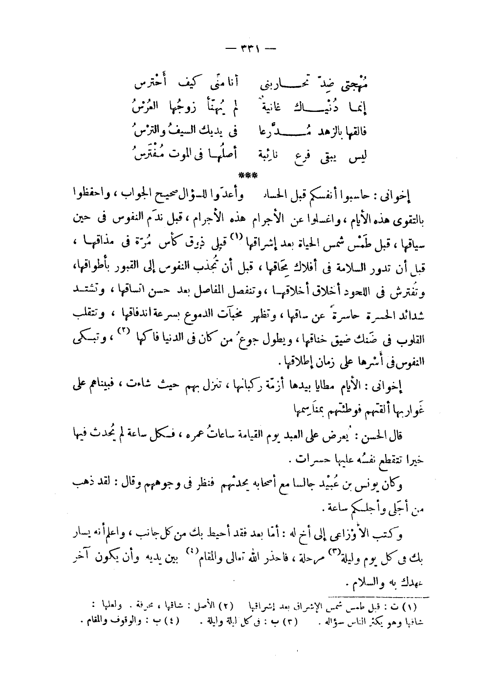 | | ( مهجتي ضد تحاربني % أنا مني كيف أحترس ) % | | ( إنما دنياك غانية % لم يهنأ زوجها العرش ) % | | ( فالقها بالزهد مدرعاً % في يديك السيف والترس ) % | | ( ليس يبقى فرع نائبة % أصلها في الموت مفترس ) % | | إخواني : حاسبوا أنفسكم قبل الحساب وأعدوا للسؤال صحيح الجواب , واحفظوا | بالتقوى هذه الأيام , واغسلوا عن الأجرام هذه الأجرام , قبل ندم النفوس في حين | سياقها , قبل طمس شمس الحياة بعد إشراقها قبل ذوق كأس مرة في مذاقها , | قبل أن تدور السلامة في أفلاك محاقها , قبل أن تجذب النفوس إلى القبور بأطواقها , | وتفترش في اللحود أخلاق أخلاقها , وتنفصل المفاصل بعد حسن اتساقها , وتشتد | شدائد الحسرة حاسرة عن ساقها , وتظهر مخبآت الدموع بسرعة اندفاقها , وتتقلب | القلوب في ضنك ضيق خناقها , ويطول جوع من كان في الدنيا فاكهاً , وتبكي | النفوس في أسرها على زمان إطلاقها . | | إخواني : الأيام مطايا بيدها أزمة ركبانها , تنزل بهم حيث شاءت , فبينا هم على | غواربها ألقتهم فوطئتهم بمناسمها . | | قال الحسن : يعرض على العبد يوم القيامة ساعات عمره , فكل ساعة لم يحدث فيها | خيرا تتقطع نفسه عليها حسرات . | | وكان يونس بن عبيد جالساً مع أصحابه يحدثهم فنظر في وجوههم وقال : لقد ذهب | من أجلي وأجلكم ساعة . | | وكتب الأوزاعي إلى أخ له : أما بعد فقد أحيط بك من كل جانب , واعلم أنه يسار | بك في كل يوم وليلة مرحلة , فاحذر الله تعالى والمقام بين يديه وأن يكون آخر | عهدك به والسلام . |