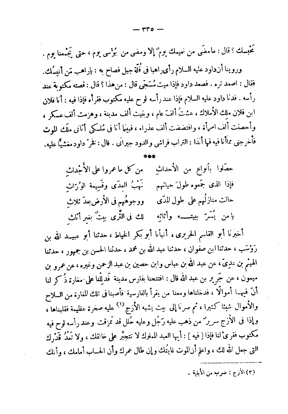 | محبسك ؟ قال : ما مضى من نعيمك يوم إلا ومضى من بؤسي يوم , حتى يجمعنا يوم . | | وروينا أن داود عليه السلام رأى راهباً في قلة جبل فصاح به : يا راهب من أنيسك . | فقال : اصعد تره . فصعد داود فإذا ميت مسجى قال : من هذا ؟ قال : قصته مكتوبة عند | رأسه . فدنا داود عليه السلام فإذا عند رأسه لوح عليه مكتوب فقرأه فإذا فيه : أنا فلان | ابن فلان ملك الأملاك , عشت ألف عام , وبنيت ألف مدينة , وهزمت ألف عسكر , | وأحصنت ألف امرأة , وافتضضت ألف عذراء , فبينما أنا في ملكي أتاني ملك الموت | فأخرجني , مما أنا فيه أنذا : التراب فراشي والدود جيراني . قال : فخر داود مغشياً عليه . | | ( حصلوا بأنواع من الأحداث % من كل ما عمروا على الأجداث ) % | | ( فإذا الذي جمعوه طول حياتهم % نهب العدى وقسيمة الوراث ) % | | ( حالت منازلهم على طول المدى % ووجوههم في الأرض بعد ثلاث ) % | | ( يا من يسر ببيته وأثاثه % لك في الثرى بيت بغير أثاث ) % | | أخبرنا أبو القاسم الحريري , أنبأنا أبو بكر الخياط , حدثنا أبو عبيد الله بن | روسب , حدثنا ابن صفوان , حدثنا عبد الله بن محمد , حدثنا الحسن بن جمهور , حدثنا | الهيثم بن عدي , عن عبد الله بن عباس وابن حصين بن عبد الرحمن وغيره , عن عمرو بن | ميمون , عن جرير بن عبد الله قال : افتتحنا بفارس مدينة فدللنا على مغارة ذكر لنا | أن فيها أموالاً . فدخلناها ومعنا من يقرأ بالفارسية فأصبنا في تلك المغارة من السلاح | والأموال شيئاً كثيراً , ثم صرنا إلى بيت يشبه الأزج عليه صخرة عظيمة فقلبناها , | وإذا في الأزج سرير من ذهب عليه رجل وعليه حلل قد تمزقت وعند رأسه لوح فيه | مكتوب فقرئ لنا فإذا [ فيه ] : أيها العبد المملوك لا تتجبر على خالقك , ولا تعد قدرك | التي جعل الله لك , واعلم أن الموت غايتك وإن طال عمرك وأن الحساب أمامك , وأنك |