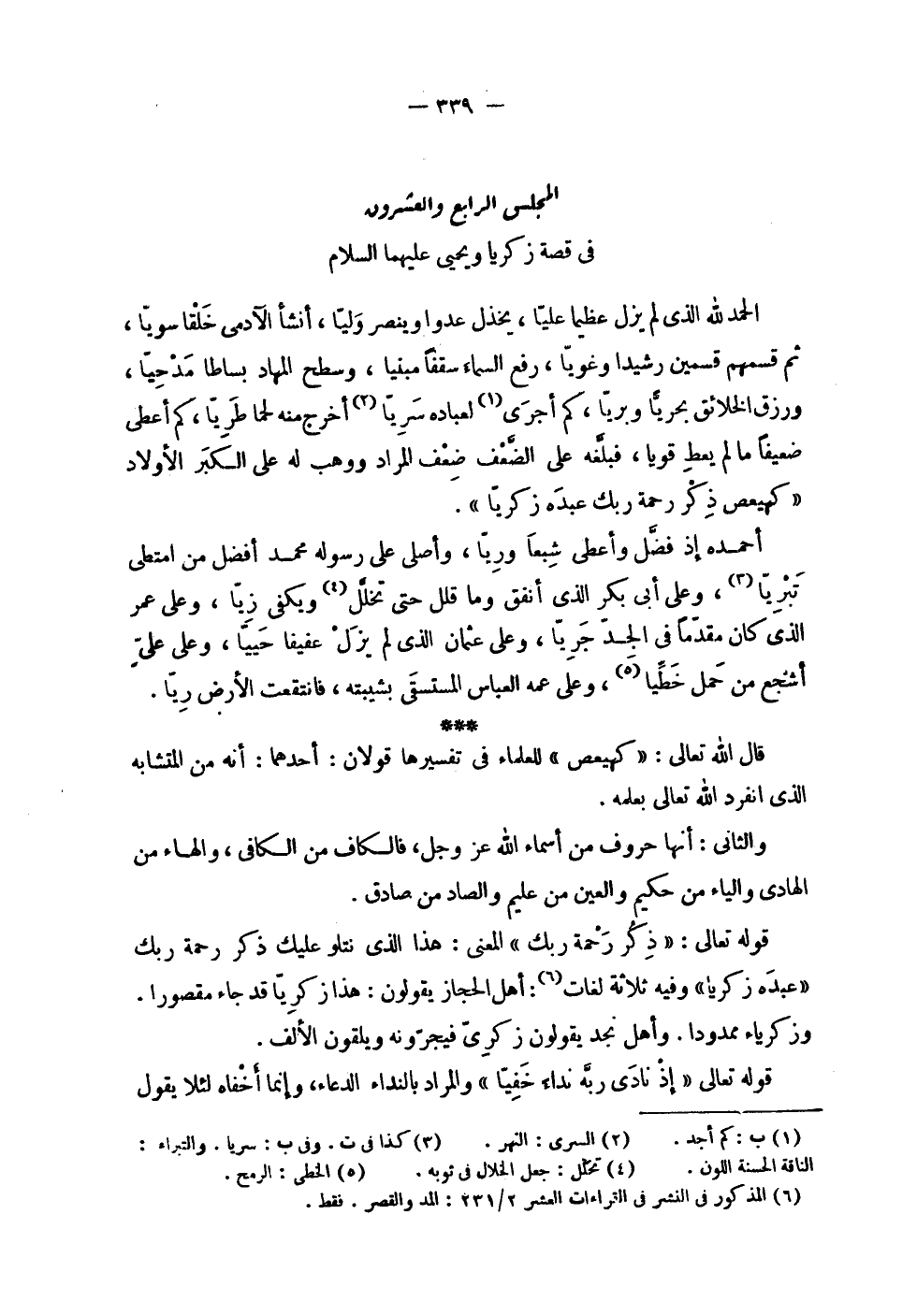 | المجلس الرابع والعشرون | في قصة زكريا ويحيى عليهما السلام | | الحمد لله الذي لم يزل عظيماً علياً , يخذل عدوا وينصر ولياً , أنشأ الآدمي خلقا سوياً , | ثم قسمهم قسمين رشيداً وغوياً , رفع السماء سقفاً مبنياً , وسطح المهاد بساطاً مدحياً , | ورزق الخلائق بحرياً وبرياً , كم أجرى لعباده سرياً أخرج منه لحماً طرياً , كم أعطى | ضعيفاً ما لم يعط قوياً , فبلغه على الضعف ضعف المراد ووهب له على الكبر الأولاد | ! 2 < كهيعص ذكر رحمة ربك عبده زكريا > 2 ! . | | أحمده إذ فضل وأعطى شبعا وريا , وأصلي على رسوله محمد أفضل من امتطى | تبريا , وعلى أبي بكر الذي أنفق وما قلل حتى تخلل ويكفي زياً , وعلى عمر | الذي كان مقدماً في الجد جرياً , وعلى عثمان الذي لم يزل عفيفاً حيياً , وعلى علي | أشجع من حمل خطيا , وعلى عمه العباس المستسقى بشيبته , فانتقعت الأرض ريا . | | قال الله تعالى : ! 2 < كهيعص > 2 ! للعلماء في تفسيرها قولان : أحدهما : أنه من المتشابه | الذي انفرد الله تعالى بعلمه . | | والثاني : أنها حروف من أسماء الله عز وجل , فالكاف من الكافي , والهاء من | الهادي , والياء من حكيم والعين من عليم والصاد من صادق . | | قوله تعالى : ! 2 < ذكر رحمة ربك > 2 ! المعنى : هذا الذي نتلو عليك ذكر رحمة ربك | ! 2 < عبده زكريا > 2 ! وفيه ثلاثة لغات : أهل الحجاز يقولون : هذا زكريا قد جاء مقصوراً . | وزكريا ممدوداً . وأهل نجد يقولون زكري فيجرونه ويلقون الألف . | | قوله تعالى ! 2 < إذ نادى ربه نداء خفيا > 2 ! والمراد بالنداء الدعاء , وإنما أخفاه لئلا يقول |
