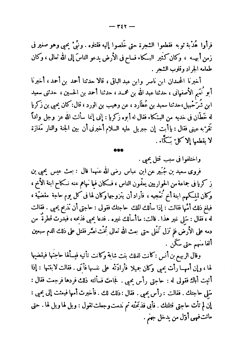 | فرأوا هدبة ثوبه فقطعوا الشجرة حتى خلصوا إليه فقتلوه . ونبيء يحيى وهو صغير في | زمن أبيه , وكان كثير البكاء فساح في الأرض يدعو الناس إلى الله تعالى , وكان | طعامه الجراد وقلوب الشجر . | | أخبرنا المحمدان ابن ناصر وابن عبد الباقي , قالا حدثنا أحمد بن أحمد , أخبرنا | أبو نعيم الأصفهاني , حدثنا عبد الله بن محمد , حدثنا أحمد بن الحسين , حدثني سعيد | ابن شرحبيل , حدثنا سعيد بن عطارد , عن وهيب بن الورد , قال : كان يحيى بن زكريا | له خطان في خديه من البكاء فقال له أبوه زكريا : إني إنما سألت الله عز وجل ولدا | تقر به عيني , فقال : يا أبت إن جبريل عليه السلام أخبرني أن بين الجنة والنار مفازة | لا يقطعها إلا كل بكاء . | | واختلفوا في سبب قتل يحيى . | | فروى سعيد بن جبير عن ابن عباس رضي الله عنهما قال : بعث عيسى يحيى بن | زكريا في جماعة من الحواريين يعلمون الناس , فكان فيما نهاهم عنه نكاح ابنة الأخ , | وكان لملكهم ابنة أخ تعجبه , فأراد أن يتزوجها وكان لها في كل يوم حاجة مقضية , | فبلغ ذلك أمها , فقالت : إذا سألك الملك حاجتك فقولي : حاجتي أن تذبح يحيى . فقالت | له , فقال : سلي غير هذا . قالت : ما أسألك غيره . فدعا يحيى فذبحه , فبدرت قطرة من | دمه على الأرض فلم تزل تغلي حتى بعث الله تعالى بخت نصر فقتل على ذلك الدم سبعين | ألفا منهم حتى سكن . | | وقال الربيع بن أنس : كانت للملك بنت شابة وكانت تأتيه فيسألها حاجتها فيقضيها | لها , وإن أمها رأت يحيى وكان جميلاً فأرادته على نفسها فأبى . فقالت لابنتها : إذا | أتيت أباك فقولي له : حاجتي رأس يحيى . فجاءت فسألته ذلك فردها فرجعت فقال : | سلي حاجتك . فقالت : رأس يحيى . فقال : ذلك لك . فأخبرت أمها فبعثت إلى يحيى : | إن لم تأت حاجتي قتلتك . فأبى فذبحته ثم ندمت وجعلت تقول : ويل لها ويل لها . حتى | ماتت فهي أول من يدخل جهنم . |