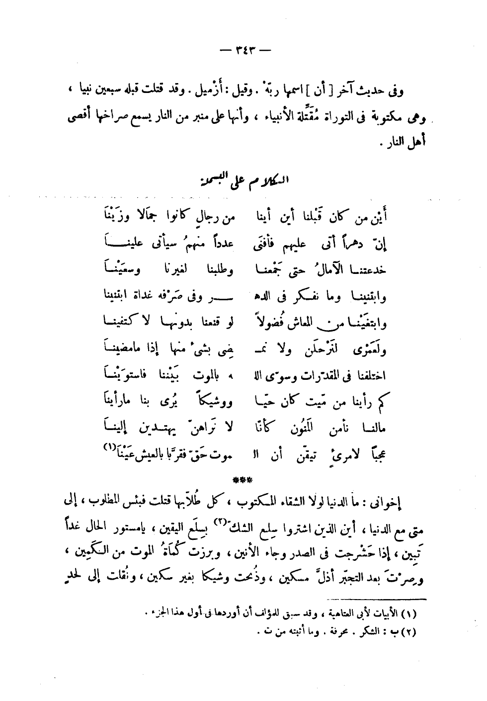 | | وفي حديث آخر [ أن ] اسمها ربه . وقيل : أزميل . وقد قتلت قبله سبعين نبيا , | وهي مكتوبة في التوراة مقتلة الأنبياء , وأنها على منبر من النار يسمع صراخها أقصى | أهل النار . | الكلام على البسملة | | ( أين من كان قبلنا أين أينا % من رجال كانوا جمالا وزينا ) % | | ( إن دهرا أتى عليهم فأفنى % عددا منهم سيأتي علينا ) % | | ( خدعتنا الآمال حتى جمعنا % وطلبنا لغيرنا وسعينا ) % | | ( وابتنينا وما نفكر في الدهر % وفي صرفه غداة ابتنينا ) % | | ( وابتغينا من المعاش فضولا % لو قنعنا بدونها لاكتفينا ) % | | ( ولعمري لنرحلن ولا نمضي % بشيء منها إذا ما مضينا ) % | | ( اختلفنا في المقدرات وسوى الله % بالموت بيننا فاستوينا ) % | | ( كم رأينا من ميت كان حيا % ووشيكا يرى بنا ما رأينا ) % | | ( ما لنا نأمن المنون كأنا % لا نراهن يهتدين إلينا ) % | | ( عجبا لامرىء تيقن أن الموت % حق فقربا بالعيش عينا ) % | | إخواني : ما الدنيا لولا الشقاء المكتوب , كل طلابها قتلت فبئس المطلوب , إلى | متى مع الدنيا , أين الذين اشتروا سلع الشك بسلع اليقين , يا مستور الحال غدا | تبين , إذا حشرجت في الصدر وجاء الأنين , وبرزت كماة الموت من الكمين , | وصرت بعد التجبر أذل مسكين , وذبحت وشيكا بغير سكين , ونقلت إلى لحد |