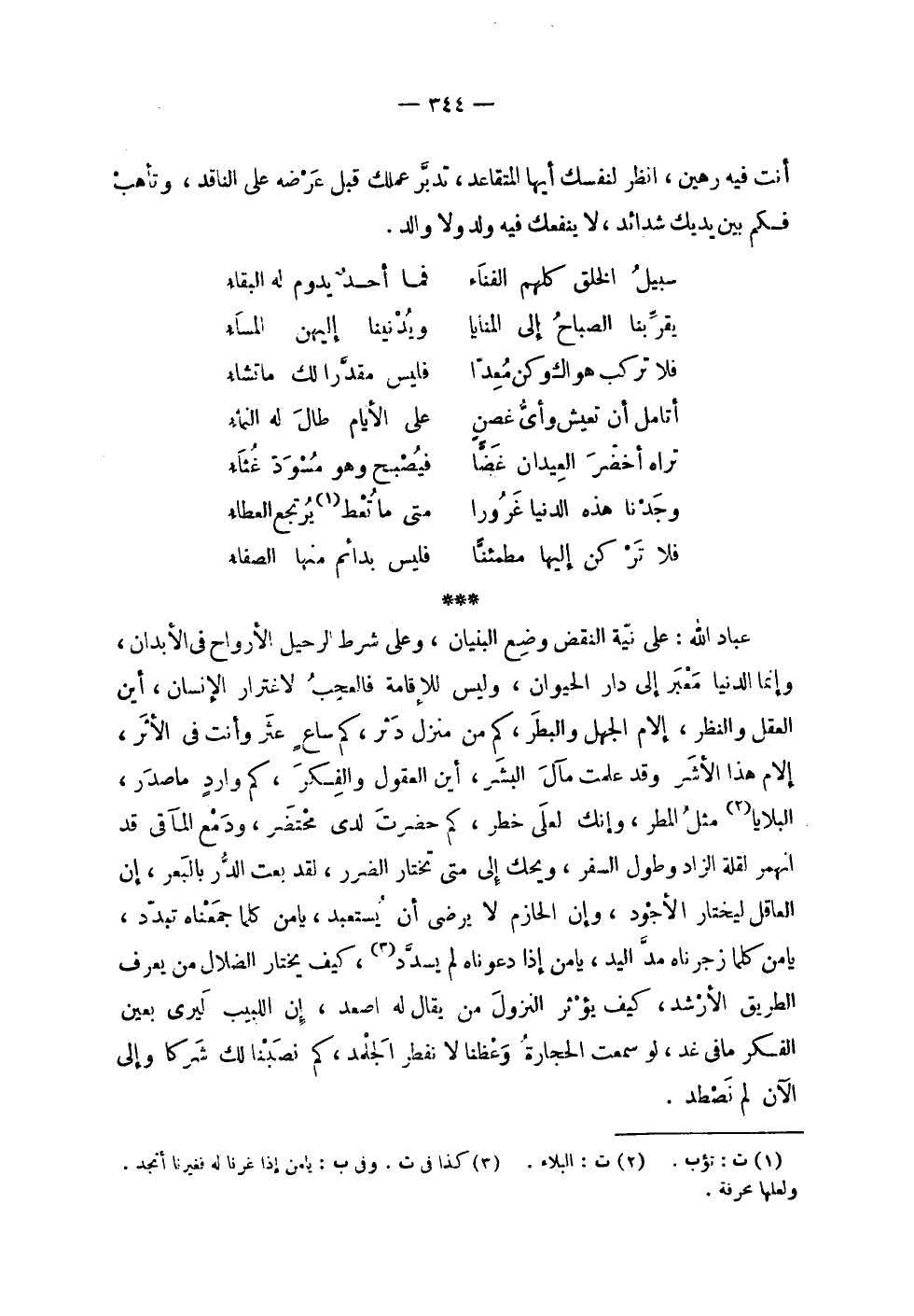 | أنت فيه رهين , انظر لنفسك أيها المتقاعد , تدبر عملك قبل عرضه على الناقد , وتأهب | فكم بين يديك شدائد , لا لا ينفعك فيه ولد ولا والد . | | ( سبيل الخلق كلهم الفناء % فما أحد يدوم له البقاء ) % | | ( يقربنا الصباح إلى المنايا % ويدنينا إليهن المساء ) % | | ( فلا تركب هواك وكن معدا % فليس مقدرا لك ما تشاء ) % | | ( أتأمل أن تعيش وأي غصن % على الأيام طال له النماء ) % | | ( تراه أخضر العيدان غضا % فيصبح وهو مسود غثاء ) % | | ( وجدنا هذه الدنيا غرورا % متى ما تعط يرتجع العطاء ) % | | ( فلا تركن إليها مطمئنا % فليس بدائم منها الصفاء ) % | | عباد الله : على نية النقض وضع البنيان , وعلى شرط الرحيل الأرواح في الأبدان , | وإنما الدنيا معبر إلى دار الحيوان , وليس للإقامة فالعجب لاغترار الإنسان , أين | العقل والنظر , إلام الجهل والبطر , كم من منزل دثر , كم ساع عثر وأنت في الأثر , | إلام هذا الأشر وقد علمت مآل البشر , أين العقول والفكر , كم وارد ما صدر , | البلايا مثل المطر , وإنك لعلى خطر , كم حضرت لدى محتضر , ودمع المآقي قد | انهمر لقلة الزاد وطول السفر , ويحك إلى متى تختار الضرر , لقد بعت الدر بالبعر , إن | العاقل ليختار الأجود , وإن الحازم لا يرضى أن يستعبد , يا من كلما جمعناه تبدد , | يا من كلما زجرناه مد اليد , يا من إذا دعوناه لم يسدد , كيف يختار الضلال من يعرف | الطريق الأرشد , كيف يؤثر النزول من يقال له اصعد , إن اللبيب ليرى بعين | الفكر ما في غد , لو سمعت الحجارة وعظنا لانفطر الجلمد , كم نصبنا لك شركاً وإلى | الآن لم نصطد . |