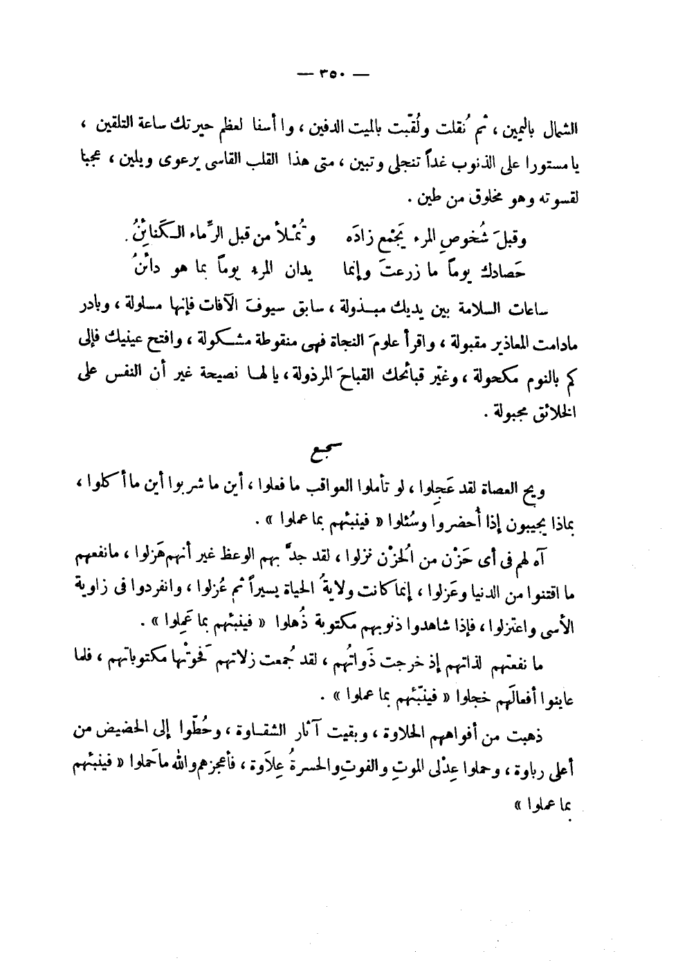 | الشمال باليمين , ثم نقلت ولقبت بالميت الدفين , وا أسفا لعظم حيرتك ساعة التلقين , | يا مستورا على الذنوب غداً تنجلى وتبين , متى هذا القلب القاسي يرعوي ويلين , عجبا | لقسوته وهو مخلوق من طين . | | ( وقبل شخوص المرء يجمع زاده % وتملأ من قبل الرماء الكنائن ) % | | ( حصادك يوماً ما زرعت وإنما % يدان المرء يوماً بما هو دائن ) % | | ساعات السلامة بين يديك مبذولة , سابق سيوف الآفات فإنها مسلولة , وبادر | ما دامت المعاذير مقبولة , واقرأ علوم النجاة فهي منقوطة مشكولة , وافتح عينيك فإلى | كم بالنوم مكحولة , وغير قبائحك القباح المرذولة , يا لها نصيحة غير أن النفس على | الخلائق مجبولة . | سجع | | ويح العصاة لقد عجلوا , لو تأملوا العواقب ما فعلوا , أين ما شربوا أين ما أكلوا , | بماذا يجيبون إذا أحضروا وسئلوا ! 2 < فينبئهم بما عملوا > 2 ! . | | آه لهم في أي حزن من الحزن نزلوا , لقد جد بهم الوعظ غير أنهم هزلوا , ما نفعهم | ما اقتنوا من الدنيا وعزلوا , إنما كانت ولاية الحياة يسيراً ثم عزلوا , وانفردوا في زاوية | الأسى واعتزلوا , فإذا شاهدوا ذنوبهم مكتوبة ذهلوا ! 2 < فينبئهم بما عملوا > 2 ! . | | ما نفعتهم لذاتهم إذ خرجت ذواتهم , لقد جمعت زلاتهم فحوتها مكتوباتهم , فلما | عاينوا أفعالهم خجلوا ! 2 < فينبئهم بما عملوا > 2 ! . | | ذهبت من أفواههم الحلاوة , وبقيت آثار الشقاوة , وحطوا إلى الحضيض من | أعلى رباوة , وحملوا عدلي الموت والفوت والحسرة علاوة , فأعجزهم والله ما حملوا ! 2 < فينبئهم بما عملوا > 2 ! . |