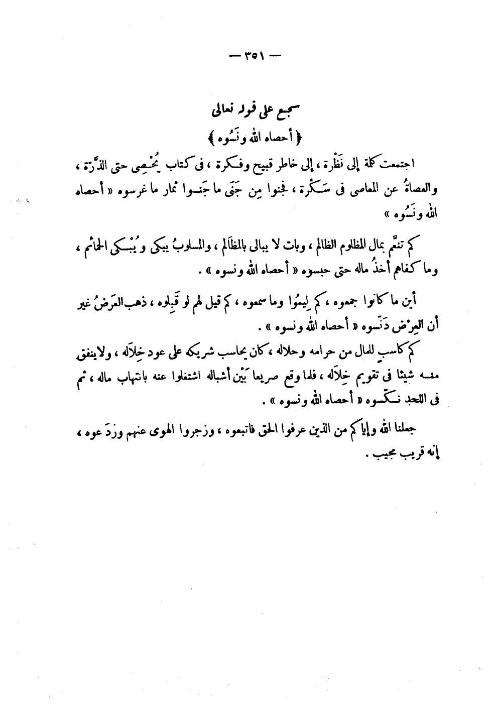 | سجع على قوله تعالى | ! 2 < أحصاه الله ونسوه > 2 ! | اجتمعت كلمة إلى نظرة , إلى خاطر قبيح وفكرة , في كتاب يحصى حتى الذرة , | والعصاة عن المعاصي في سكرة , فجنوا من جنى ما جنوا ثمار ما غرسوه ! 2 < أحصاه الله ونسوه > 2 ! . | | كم تنعم بمال المظلوم الظالم , وبات لا يبالي بالمظالم , والمسلوب يبكي ويبكي الحمائم , | وما كفاهم أخذ ماله حتى حبسوه ! 2 < أحصاه الله ونسوه > 2 ! . | | أين ما كانوا جمعوه , كم ليموا وما سمعوه , كم قيل لهم لو قبلوه , ذهب العرض غير | أن العرض دنسوه ! 2 < أحصاه الله ونسوه > 2 ! . | | كم كاسب للمال من حرامه وحلاله , كان يحاسب شريكه على عود خلاله , ولا ينفق | منه شيئا في تقويم خلاله , فلما وقع صريعا بين أشباله اشتغلوا عنه بانتهاب ماله , ثم | في اللحد نكسوه ! 2 < أحصاه الله ونسوه > 2 ! . | | جعلنا الله وإياكم من الذين عرفوا الحق فاتبعوه , وزجروا الهوى عنهم وردعوه , | إنه قريب مجيب . |