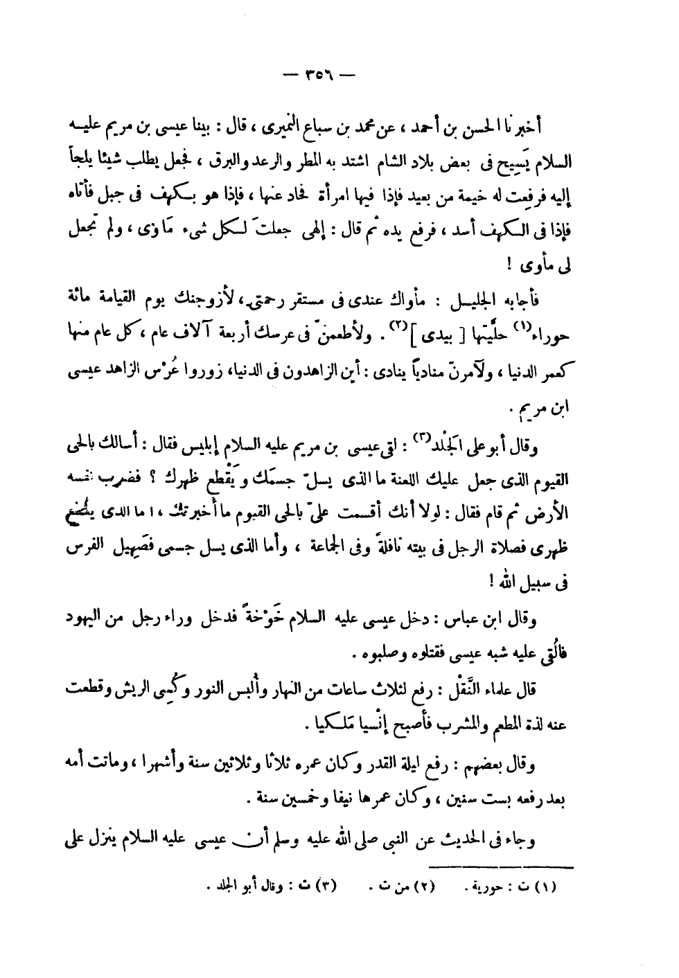 | | أخبرنا الحسن بن أحمد , عن محمد بن سباع النميري , قال : بينا عيسى بن مريم عليه | السلام يسيح في بعض بلاد الشام اشتد به المطر والرعد والبرق , فجعل يطلب شيئاً يلجأ | إليه فرفعت له خيمة من بعيد فإذا فيها امرأة فحاد عنها , فإذا هو بكهف في جبل فأتاه | فإذا في الكهف أسد , فرفع يده ثم قال : إلهي جعلت لكل شيء مأوى , ولم تجعل | لي مأوى ! | | فأجابه الجليل : مأواك عندي في مستقر رحمتي , لأزوجنك يوم القيامة مائة | حوراء حليتها [ بيدي ] . ولأطعمن في عرسك أربعة آلاف عام , كل عام منها | كعمر الدنيا , ولآمرن منادياً ينادي : أين الزاهدون في الدنيا , زوروا عرس الزاهد عيسى | ابن مريم . | | وقال أبو علي الجلد : لقي عيسى بن مريم عليه السلام إبليس فقال : أسالك بالحي | القيوم الذي جعل عليك اللعنة ما الذي يسل جسمك ويقطع ظهرك ! فضرب نفسه | الأرض ثم قام فقال : لولا أنك أقسمت علي بالحي القيوم ما أخبرتك , أما الذي يقطع | ظهري فصلاة الرجل في بيته نافلة وفي الجماعة , وأما الذي يسل جسمي فصهيل الفرس | في سبيل الله ! | | وقال ابن عباس : دخل عيسى عليه السلام خوخة فدخل وراء رجل من اليهود | فألقي عليه شبه عيسى فقتلوه وصلبوه . | | قال علماء النقل : رفع لثلاث ساعات من النهار وألبس النور وكسي الريش وقطعت | عنه لذة المطعم والمشرب فأصبح إنسياً ملكياً . | | وقال بعضهم : رفع ليلة القدر وكان عمره ثلاثاً وثلاثين سنة وأشهراً , وماتت أمه | بعد رفعه بست سنين , وكان عمرها نيفاً وخمسين سنة . | | وجاء في الحديث عن النبي صلى الله عليه وسلم أن عيسى عليه السلام ينزل على |