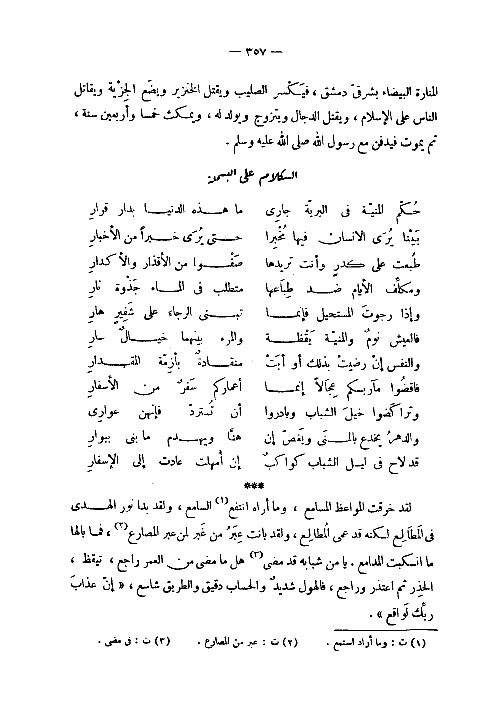 | المنارة البيضاء بشرقي دمشق , فيكسر الصليب ويقتل الخنزير ويضع الجزية ويقاتل | الناس على الإسلام , ويقتل الدجال ويتزوج ويولد له , ويمكث خمساً وأربعين سنة | ثم يموت فيدفن مع رسول الله صلى الله عليه وسلم . | الكلام على البسملة | | ( حكم المنية في البرية جاري % ما هذه الدنيا بدار قرار ) % | | ( بينا يرى الإنسان فيها مخبراً % حتى يرى خبراً من الأخبار ) % | | ( طبعت على كدر وأنت تريدها % صفواً من الأقذار والأكدار ) % | | ( ومكلف الأيام ضد طباعها % متطلب في الماء جذوة نار ) % | | ( وإذا رجوت المستحيل فإنما % تبني الرجاء على شفير هار ) % | | ( فالعيش نوم والمنية يقظة % والمرء بينهما خيال سار ) % | | ( والنفس إن رضيت بذلك أو أبت % منقادة بأزمة المقدار ) % | | ( فاقضوا مآربكم عجالاً إنما % أعماركم سفر من الأسفار ) % | | ( وتراكضوا خيل الشباب وبادروا % أن تسترد فإنهن عوارى ) % | | ( والدهر يخدع بالمنى ويغص إن % هنا ويهدم ما بنى ببوار ) % | | ( قد لاح في ليل الشباب كواكب % إن أمهلت عادت إلى الأسفار ) % | | لقد خرقت المواعظ المسامع , وما أراه انتفع السامع , ولقد بدا نور الهدى | في المطالع لكنه قد عمى المطالع , ولقد بانت عبر من غبر لمن عبر المصارع , فما بالها | ما انسكبت المدامع . يا من شبابه قد مضى هل ما مضى من العمر راجع , تيقظ , | الحذر ثم اعتذر وراجع , فالهول شديد والحساب دقيق والطريق شاسع , ! 2 < إن عذاب ربك لواقع > 2 ! . |
