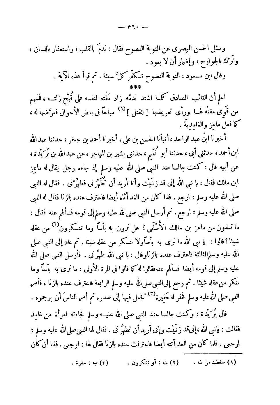 | | وسئل الحسن البصري عن التوبة النصوح فقال : ندم بالقلب , واستغفار باللسان , | وترك بالجوارح , وإضمار أن لا يعود . | | وقال ابن مسعود : التوبة النصوح تكفر كل سيئة . ثم قرأ هذه الآية . | | اعلم أن التائب الصادق كلما اشتد ندمه زاد مقته لنفسه على قبح زلته , فمنهم | من قوي مقته لها ورأى تعريضها [ للقتل ] مباحاً في بعض الأحوال فعرضها له , | كما فعل ماعز والغامدية . | | أخبرنا ابن عبد الواحد , أنبأنا الحسن بن علي , أخبرنا أحمد بن جعفر , حدثنا عبد الله | ابن أحمد , حدثني أبي , حدثنا أبو نعيم , حدثني بشير بن المهاجر , عن عبد الله بن بريدة , | عن أبيه قال : كنت جالساً عند النبي صلى الله عليه وسلم إذ جاءه رجل يقال له ماعز | ابن مالك فقال : يا نبي الله إني قد زنيت وأنا أريد أن تطهرني فطهرني . فقال له النبي | صلى الله عليه وسلم : ارجع . فلما كان من الغد أتاه أيضاً فاعترف عنده بالزنا فقال له النبي | صلى الله عليه وسلم : ارجع . ثم أرسل النبي صلى الله عليه وسلم إلى قومه فسألهم عنه فقال : | ما تعلمون من ماعز بن مالك الأسلمي ؟ هل ترون به بأساً وما تنكرون من عقله | شيئاً ؟ قالوا : يا نبي الله ما نرى به بأساً ولا ننكر من عقله شيئاً . ثم عاد إلى النبي صلى الله عليه وسلم | الثالثة فاعترف عنده بالزنا وقال : يا نبي الله طهرني . فأرسل النبي صلى الله عليه وسلم | إلى قومه أيضاً فسألهم عنه فقالوا له كما قالوا في المرة الأولى : ما نرى به بأساً وما | ننكر من عقله شيئاً . ثم رجع إلى النبي صلى الله عليه وسلم الرابعة فاعترف عنده بالزنا , فأمر | النبي صلى الله عليه وسلم فحفر له حفيرة فجعل فيها إلى صدره ثم أمر الناس أن يرجموه . | | قال بريدة : وكنت جالساً عند النبي صلى الله عليه وسلم فجاءته امرأة من غامد | فقالت : يا نبي الله , إني قد زنيت وإني أريد أن تطهرني . فقال لها النبي صلى الله عليه وسلم : | ارجعي . فلما كانت من الغد أتته أيضاً فاعترفت عنده بالزنا فقال لها : ارجعي . فلما أن كان |