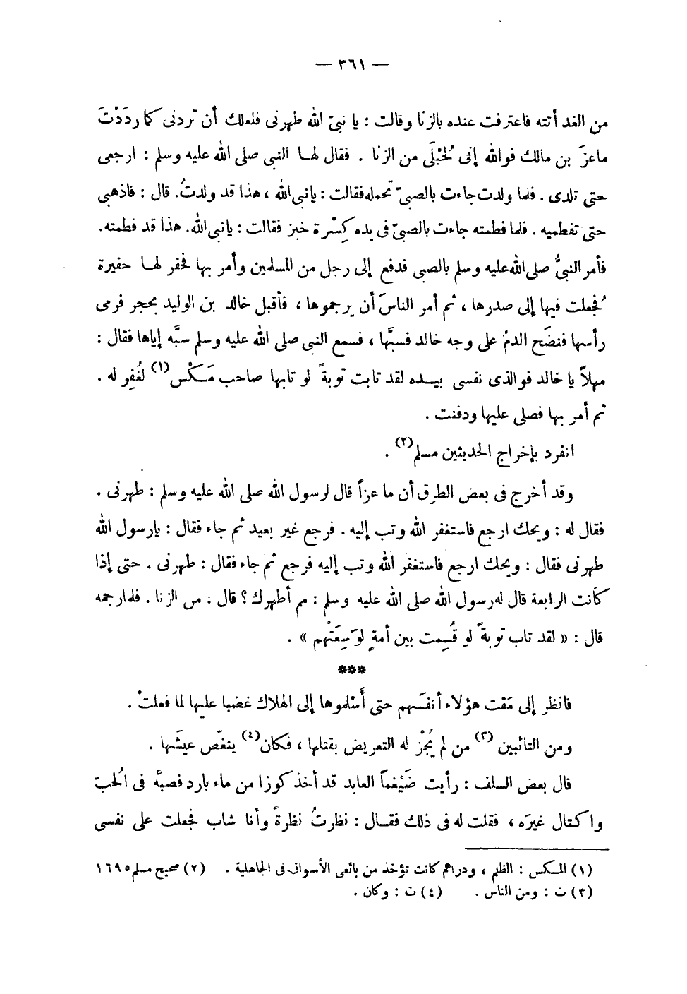 | من الغد أتته فاعترفت عنده بالزنا وقالت : يا نبي الله طهرني فلعلك أن تردني كما رددت | ماعز بن مالك فوالله إني لحبلى من الزنا , فقال لها النبي صلى الله عليه وسلم : ارجعي | حتى تلدي . فلما ولدت جاءت بالصبي تحمله فقالت : يا نبي الله , هذا قد ولدت . قال : فاذهبي | حتى تفطميه . فلما فطمته جاءت بالصبي في يده كسرة خبز فقالت : يا نبي الله . هذا قد فطمته . | فأمر النبي صلى الله عليه وسلم بالصبي فدفع إلى رجل من المسلمين وأمر بها فحفر لها حفيرة | فجعلت فيها إلى صدرها , ثم أمر الناس أن يرجموها , فأقبل خالد بن الوليد بحجر فرمى | رأسها فنضخ الدم على وجه خالد فسبها , فسمع النبي صلى الله عليه وسلم سبه إياها فقال : | مهلا يا خالد فوالذي نفسي بيده لقد تابت توبة لو تابها صاحب مكس لغفر له . | ثم أمر بها فصلي عليها ودفنت . | | انفرد بإخراج الحديثين مسلم . | | وقد أخرج في بعض الطرق أن ماعزاً قال لرسول الله صلى الله عليه وسلم : طهرني . | فقال له : ويحك ارجع فاستغفر الله وتب إليه . فرجع غير بعيد ثم جاء فقال : يا رسول الله | طهرني فقال : ويحك ارجع فاستغفر الله وتب إليه . فرجع ثم جاء فقال : طهرني . حتى إذا | كانت الرابعة قال له رسول الله صلى الله عليه وسلم : مم أطهرك ؟ قال : من الزنا . فلما رجمه . | قال : ' لقد تاب توبة لو قسمت بين أمة لوسعتهم ' . | | فانظر إلى مقت هؤلاء أنفسهم حتى أسلموها إلى الهلاك غضبا عليها لما فعلت . | | ومن التائبين من لم يجز له التعريض بقتلها , فكان ينغص عيشها . | | قال بعض السلف : رأيت ضيغماً العابد فد أخذ كوزاً من ماء بارد فصبه في الحب | واكتال غيره , فقلت له في ذلك فقال : نظرت نظرة وأنا شاب فجعلت على نفسي |