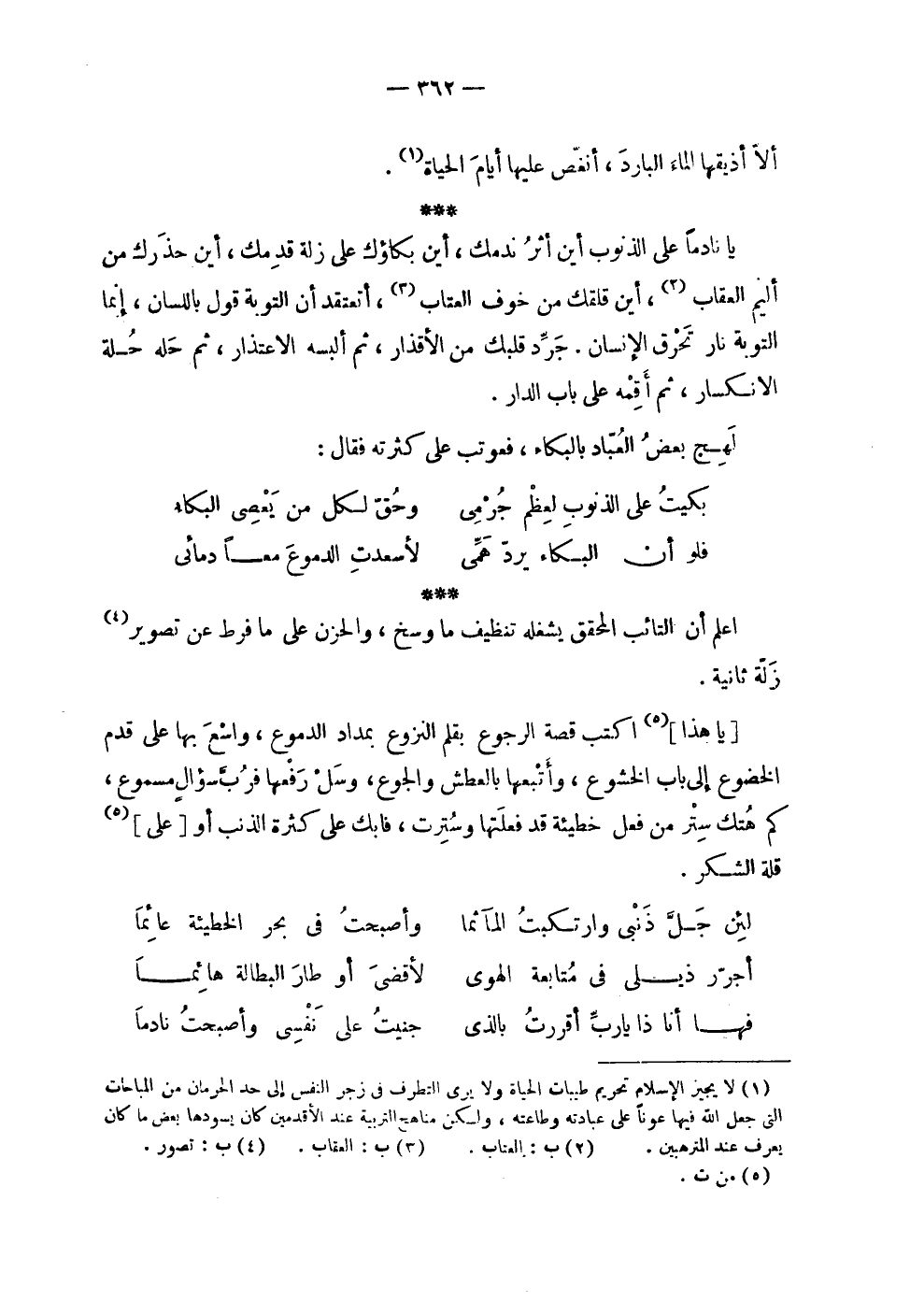 | ألا أذيقها الماء البارد , أنغص عليها أيام الحياة . | | يا نادماً على الذنوب أين أثر ندمك , أين بكاؤك على زلة قدمك , أين حذرك من | أليم العقاب , أين قلقك من خوف العتاب , أتعتقد أن التوبة قول باللسان , إنما | التوبة نار تحرق الإنسان . جرد قلبك من الأقذار , ثم ألبسه الاعتذار , ثم حله حلة | الانكسار , ثم أقمه على باب الدار . | | لهج بعض العباد بالبكاء , فعوتب على كثرته فقال : | | ( بكيت على الذنوب لعظم جرمي % وحق لكل من يعصي البكاء ) % | | ( فلو أن البكاء يرد همي % لأسعدت الدموع معا دمائي ) % | | اعلم أن التائب المحقق يشغله تنظيف ما وسخ , والحزن على ما فرط عن تصوير | زلة ثانية . | | [ يا هذا ] اكتب قصة الرجوع بقلم النزوع بمداد الدموع , واسع بها على قدم | الخضوع إلى باب الخشوع , وأتبعها بالعطش والجوع , وسل رفعها فرب سؤال مسموع , | كم هتك ستر من فعل خطيئة قد فعلتها وسترت , فابك على كثرة الذنب أو [ على ] | قلة الشكر . | | ( لئن جل ذنبي وارتكبت المآثما % وأصبحت في بحر الخطيئة عائماً ) % | | ( أجرر ذيلي في متابعة الهوى % لأقضي أوطار البطالة هائما ) % | | ( فها أنا ذا يا رب أقررت بالذي % جنيت على نفسي وأصبحت نادماً ) % |