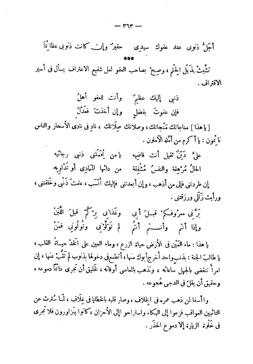 | | ( أجل ذنوبي عند عفوك سيدي % حقير وإن كانت ذنوبي عظائما ) % | | تشبث بذيل الحلم , وصح بصاحب العفو لعل شفيع الاعتراف يسأل في أسير | الاقتراف . | | ( ذنبي إليك عظيم % وأنت للعفو أهل ) % | | ( فإن عفوت بفضل % وإن أخذت فعدل ) % | | [ يا هذا ] مناجاتك منجاتك , وصلاتك صلاتك , ناد في نادي الأسحار والناس | نائمون : يا أكرم من أمله الآملون . | | ( على دين ثقيل أنت قاضيه % يا من يحملني ذنبي رجائيه ) % | | ( الحل مرهقة والنفس مشفقة % من دائها المتمادي أو تداويه ) % | | إن طردتني فإلى من أذهب , وإن أبعدتني فإليك أنسب , علمت ذنبي وخلقتني , | ورأيت زللي ورزقتني . | | ( برني معروفكم قبل أبي % وغذاني بركم قبل اللبن ) % | | ( وإذا أنتم وأنتم أنتم % لم تولوني وتولوني فمن ) % | | يا هذا : ماء العين في الأرض حياة الزرع , وماء العين على الخد حياة القلب , | يا طالب الجنة : بذنب واحد أخرج أبوك منها , أتطمع في دخولها بذنوب لم تتب عنها , إن | امرأ تنقضي بالجهل ساعاته , وتذهب بالمعاصي أوقاته , لخليق أن تجري دائماً دموعه , | وحقيق أن يقل في الدجى هجوعه . | | وا أسفا لمن ذهب عمره في الخلاف , وصار قلبه بالخطايا في غلاف , لما سترت عن | التائبين العواقب فزعوا إلى البكاء واستارحوا إلى الأحزان , كانوا يتزاورون فلا تجري | في خلوة الزيارة إلا دموع الحذر . |