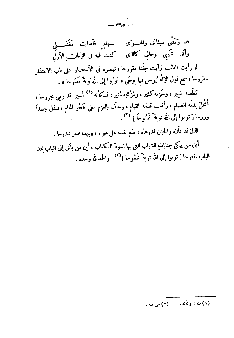 | | ( قد رمتني سيئاتي والهوى % بسهام فأصابت مقتلي ) % | | ( وأتى شيبي وحالي كالذي % كنت فيه في الزمان الأول ) % | | لو رأيت التائب لرأيت جفنا مقروحاً , تبصره في الأسحار على باب الاعتذار | مطروحا , سمع قول الإله يوحى فيما يوحى ! 2 < توبوا إلى الله توبة نصوحا > 2 ! . | | مطعمه يسير , وحزنه كثير , ومزعجه مثير , فكأنه أسير قد رمى مجروحا , | أنحل بدنه الصيام , وأتعب قدمه القيام , وحلف بالعزم على هجر المنام , فبذل جسداً | وروحاً ! 2 < توبوا إلى الله توبة نصوحا > 2 ! . | | الذل قد علاه والحزن قد وهاه , يذم نفسه على هواه , وبهذا صار ممدوحا | | أين من يبكي جنايات الشباب التي بها اسود الكتاب , أين من يأتي إلى الباب يحد | الباب مفتوحا ! 2 < توبوا إلى الله توبة نصوحا > 2 ! . والحمد لله وحده . |