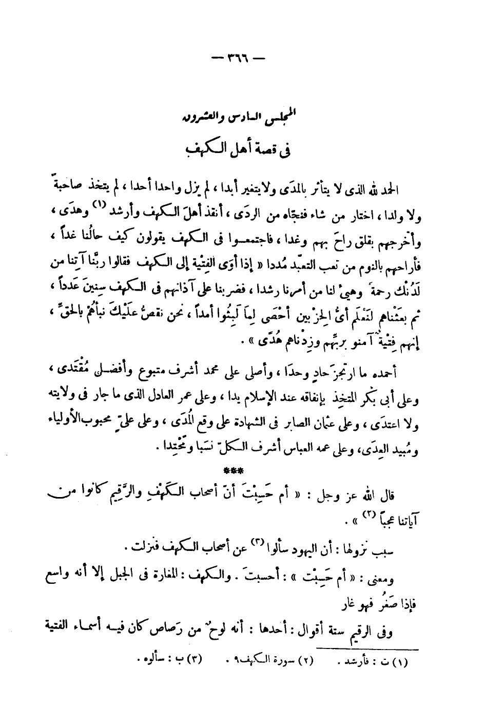 | المجلس السادس والعشرون | في قصة أهل الكهف | | الحمد لله الذي لا يتأثر بالمدى ولا يتغير أبداً , لم يزل واحداً أحداً , لم يتخذ صاحبة | ولا ولداً , اختار من شاء فنجاه من الردى , أنقذ أهل الكهف وأرشد وهدى , | وأخرجهم بقلق راح بهم وغدا , فاجتمعوا في الكهف يقولون كيف حالنا غداً , | فأراحهم بالنوم من تعب التعبد مدداً ^ ( إذا أوى الفتية إلى الكهف فقالوا ربنا آتنا من | لدنك رحمة وهيىء لنا من أمرنا رشداً , فضربنا على آذانهم في الكهف سنين عدداً , | ثم بعثناهم لتعلم أي الحزبين أحصى لما لبثوا أمداً , نحن نقص عليك نبأهم بالحق , | إنهم فتية آمنوا بربهم وزدناهم هدى ) ^ . | | أحمده ما ارتجز حاد وحداً , وأصلي على محمد أشرف متبوع وأفضل مقتدي , | وعلى أبي بكر المتخذ بإنفاقه عند الإسلام يدا , وعلى عمر العادل الذي ما جار في ولايته | ولا اعتدى , وعلى عثمان الصابر في الشهادة على وقع المدى , وعلى علي محبوب الأولياء | ومبيد العدى , وعلى عمه العباس أشرف الكل نسباً ومحتداً . | | قال الله عز وجل : ! 2 < أم حسبت أن أصحاب الكهف والرقيم كانوا من آياتنا عجبا > 2 ! . | | سبب نزولها : أن اليهود سألوا عن أصحاب الكهف فنزلت . | | ومعنى : ! 2 < أم حسبت > 2 ! : أحسبت . والكهف : المغارة في الجبل إلا أنه واسع | فإذا صغر فهو غار . | | وفي الرقيم ستة أقوال : أحدها : أنه لوح من رصاص كان فيه أسماء الفتية |