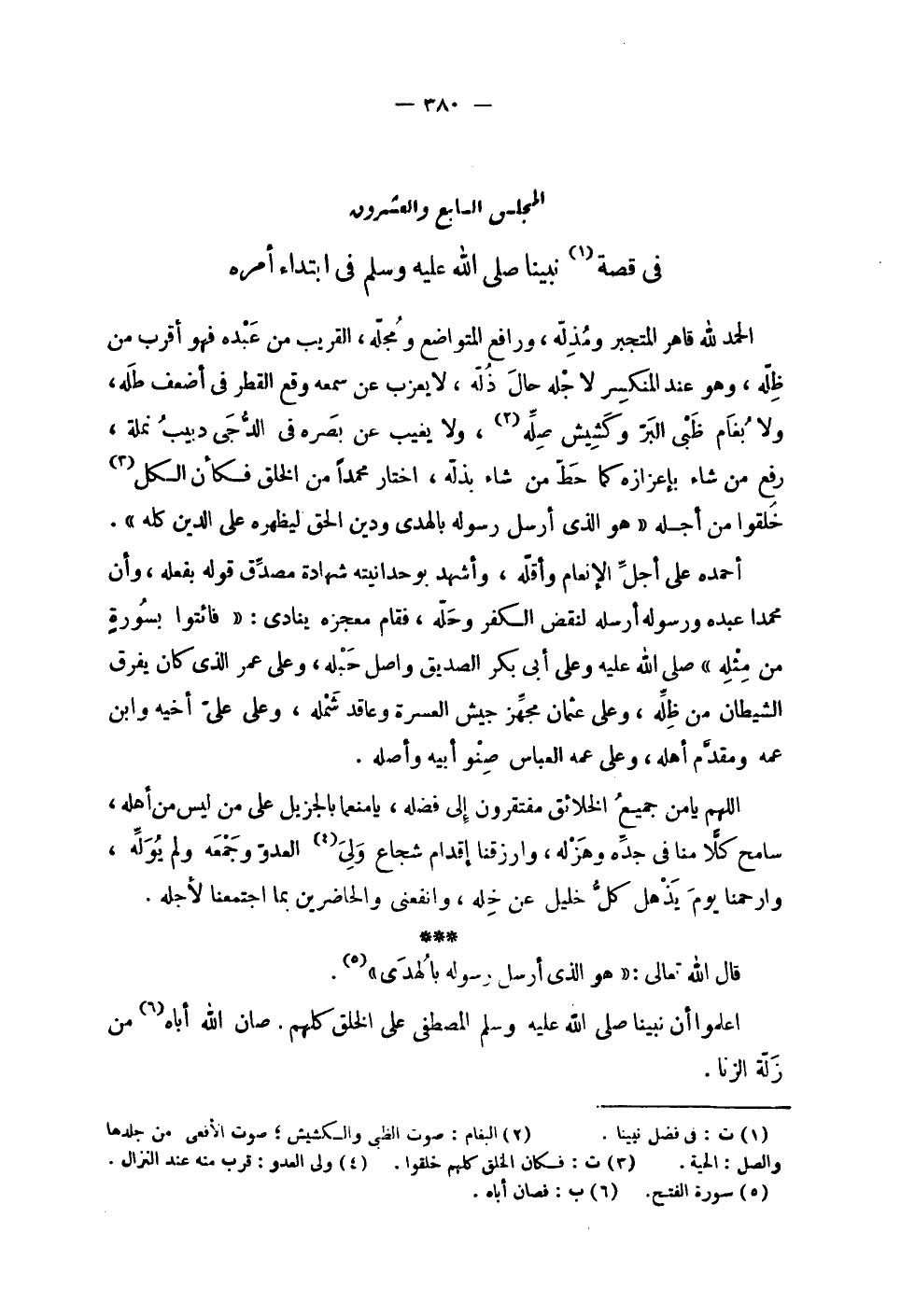 | المجلس السابع والعشرون | في قصة نبينا صلى الله عليه وسلم في ابتداء أمره | | الحمد لله قاهر المتجبر ومذله , ورافع المتواضع ومجله , القريب من عبده فهو أقرب من | ظله , وهو عند المنكسر لا جله حال ذله , لا يعزب عن سمعه وقع القطر في أضعف طله , | ولا بغام ظبي البر وكشيش صله , ولا يغيب عن بصره في الدجى دبيب نمله , | رفع من شاء بإعزازه كما حط من شاء بذله , اختار محمداً من الخلق فكأن الكل | خلقوا من أجله ! 2 < هو الذي أرسل رسوله بالهدى ودين الحق ليظهره على الدين كله > 2 ! . | | أحمده على أجل الإنعام وأقله , وأشهد بوحدانيته شهادة مصدق قوله بفعله , وأن | محمداً عبده ورسوله أرسله لنقض الكفر وحله , فقام معجزه ينادي : ^ ( فائتوا بسورة | من مثله ) ^ صلى الله عليه وسلم وعلى أبي بكر الصديق واصل حبله , وعلى عمر الذي كان يفرق | الشيطان من ظله , وعلى عثمان مجهز جيس العسرة وعاقد شمله , وعلى علي أخيه وابن | عمه ومقدم أهله , وعلى عمه العباس صنو أبيه وأصله . | | اللهم يا من جميع الخلائق مفتقرون إلى فضله , يا منعماً بالجزيل على من ليس من أهله , | سامح كلا منا في جده وهزله , وارزقنا إقدام شجاع ولي العدو وجمعه ولم يوله , | وارحمنا يوم يذهل كل خليل عن خله , وانفعني والحاضرين بما اجتمعنا لأجله . | | قال الله تعالى : ! 2 < هو الذي أرسل رسوله بالهدى > 2 ! . | | اعلموا أن نبينا صلى الله عليه وسلم المصطفى على الخلق كلهم . صان الله أباه من | زلة الزنا . |
