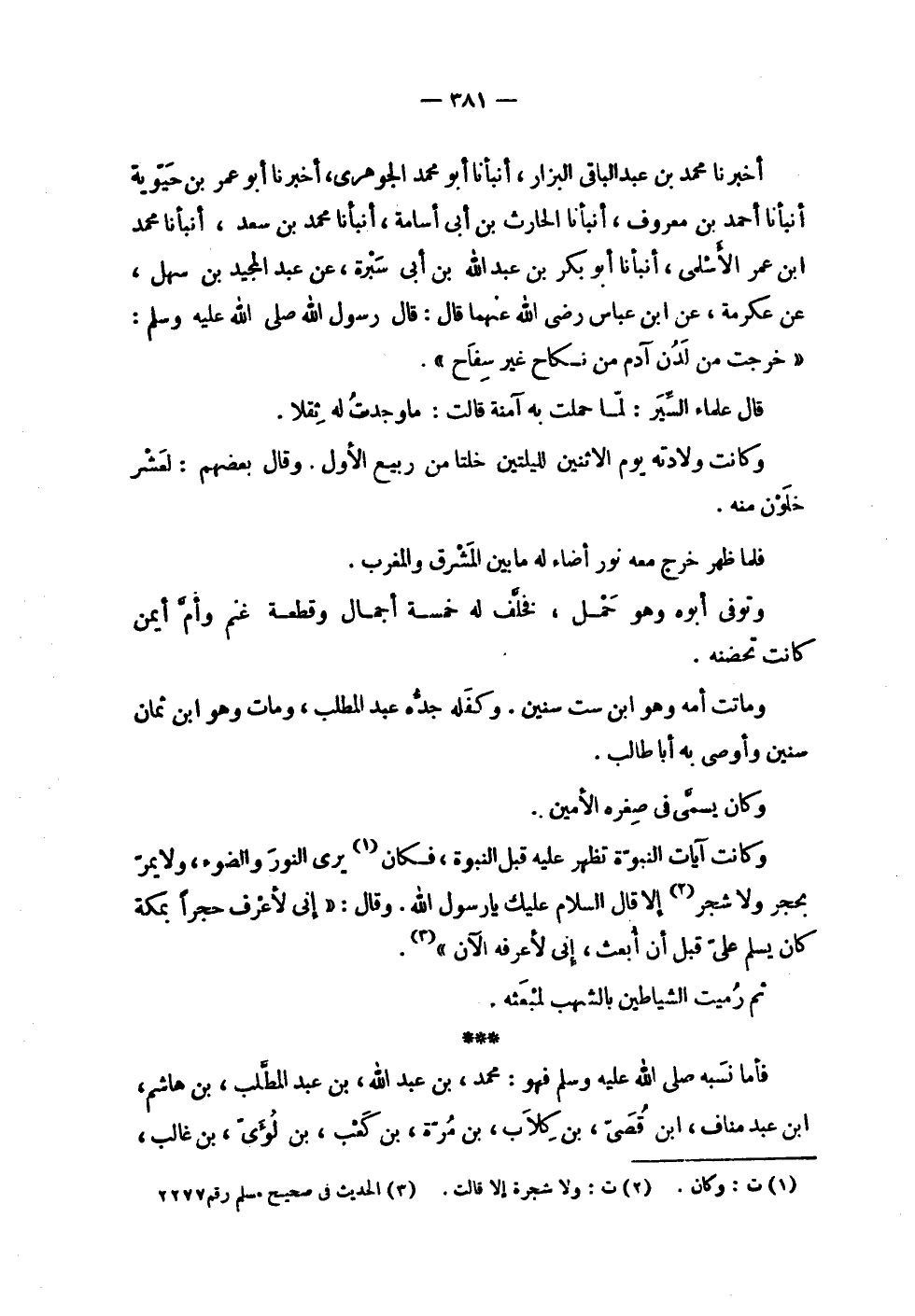 | | أخبرنا محمد بن عبد الباقي البزار , أنبأنا أبو محمد الجوهري , أخبرنا أبو عمر بن حيوية | أنبأنا أحمد بن معروف , أنبأنا الحارث بن أبي أسامة , أنبأنا محمد بن سعد , أنبأنا محمد | ابن عمر الأسلمي , أنبأنا أبو بكر بن عبد الله بن أبي سبرة , عن عبد المجيد بن سهل , | عن عكرمة , عن ابن عباس رضي الله عنهما قال : قال رسول الله صلى الله عليه وسلم : | ' خرجت من لدن آدم من نكاح غير سفاح ' . | | قال علماء السير : لما حملت به آمنة قالت : ما وجدت له ثقلاً . | | وكانت ولادته يوم الاثنين لليلتين خلتا من ربيع الأول . وقال بعضهم : لعشر | خلون منه . | | فلما ظهر خرج معه نور أضاء له ما بين المشرق والمغرب . | | وتوفي أبوه وهو حمل , فخلف له خمسة أجمال وقطعة غنم وأم أيمن | كانت تحضنه . | | وماتت أمه وهو ابن ست سنين . وكفله جده عبد المطلب , ومات وهو ابن ثمان | سنين وأوصى به أبا طالب . | | وكان يسمى في صغره الأمين . | | وكانت آيات النبوة تظهر عليه قبل النبوة , فكان يرى النور والضوء , ولا يمر | بحجر ولا شجر إلا قال السلام عليك يا رسول الله . وقال : ' إني لأعرف حجراً بمكة | كان يسلم علي قبل أن أبعث , إني لأعرفه الآن ' . | | ثم رميت الشياطين بالشهب لمبعثه . | | فأما نسبه صلى الله عليه وسلم فهو : محمد , بن عبد الله , بن عبد المطلب , بن هاشم , | ابن عبد مناف , ابن قصي , بن كلاب , بن مرة , بن كعب , بن لؤي , بن غالب , |