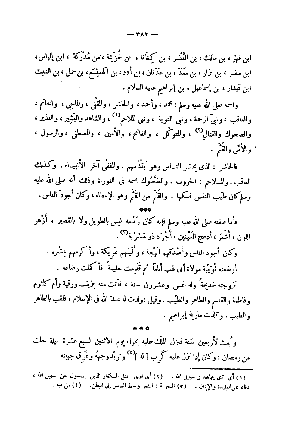 | ابن فهر , بن مالك , بن النضر , بن كنانة , بن خزيمة , من مدركة , ابن إلياس , | ابن مضر , بن نزار , بن معد , بن عدنان , بن أدد , بن الهميسع , بن حمل , بن النبت | ابن قيدار , بن إسماعيل , بن إبراهيم عليه السلام . | | واسمه صلى الله عليه وسلم : محمد , وأحمد , والحاشر , والمقفي , والماحي , والخاتم , | والعاقب , ونبي الرحمة , ونبي التوبة , ونبي الملاحم , والشاهد والبشير , والنذير , | والضحوك والقتال , والمتوكل , والفاتح , والأمين , والمصطفى , والرسول , | والأمي والقثم . | | فالحاشر : الذي يحشر الناس وهو يقدمهم . والمقفي آخر الأنبياء . وكذلك | العاقب . والملاحم : الحروب . والضحوك اسمه في التوراة وذلك أنه صلى الله عليه وسلم | كان طيب النفس فكهاً . والقثم من القثم وهو الإعطاء , وكان أجود الناس . | | فأما صفته صلى الله عليه وسلم فإنه كان ربعة ليس بالطويل ولا بالقصير , أزهر | اللون , أشعر , أدعج العينين , أجرد ذو مسربة . | | وكان أجود الناس وأصدقهم لهجة , وألينهم عريكة , وأكرمهم عشرة . | | أرضعته ثويبة مولاة أبي لهب أياماً ثم قدمت حليمة فأكملت رضاعته . | | تزوجته خديجة وله خمس وعشرون سنة , فأتت منه بزينب ورقية وأم كلثوم | وفاطمة والقاسم والطاهر والطيب . وقيل : ولدت له عبد الله في الإسلام , فلقب بالطاهر | والطيب . وولدت مارية إبراهيم . | | وبعث لأربعين سنة فنزل الملك عليه بحراء يوم الاثنين لسبع عشرة ليلة خلت | من رمضان : وكان إذا نزل عليه كرب [ له ] وتربد وجهه وعرق جبينه . |